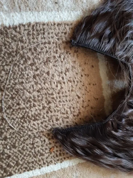 Для тех , что красит волосы в черный цвет, не подойдет, т.к. будет заметная разница. Дело в том, что цвет искусственных волос не чисто черный, как уголь, он скорее как темный мокко и присутствует характерный блеск самого материала волос . Волосы от тесьмы немного вьются как на картинке, но в конце просто прямые сантиметров на десять. Есть прозрачная леска, чтобы закрепить волосы на голове, как обруч, т.е. никаких заколок и долго с такой резинкой не проходишь, она впивается в кожу, поэтому я заказала отдельно заколки и буду пришивать сама. А так все неплохо.