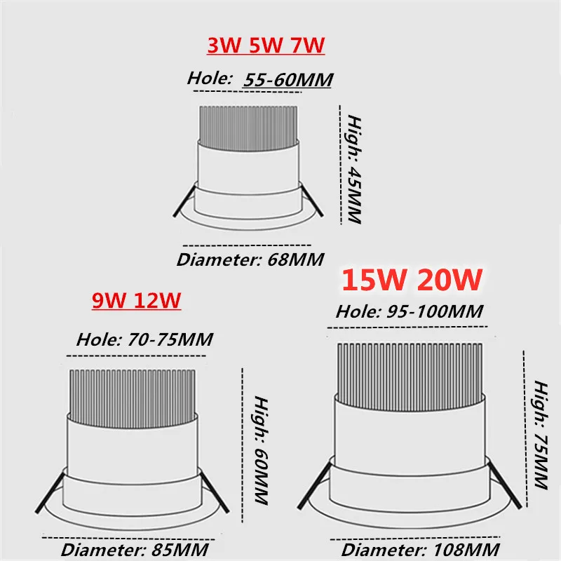 Название продукта: классический круглый COB светодиодный встраиваемый светильникМатериал: литье алюминияИсточник светодиодов: чип COBМощность: 5 Вт 7 Вт 9 Вт 12 ВтВход (переменный ток): 86-265V 50/60HzИндекс цветопередачи (CRI): RA>86Цвет корпуса лампы: белыйСветовой поток: 100-110лм/ВтЦветовая температура: теплый белый (3000-3500K), натуральный белый (4000-4500K), белый (6000-6500K).Рабочая температура: -25 ℃-+ 60 ℃Размер: как на картинкеУгол луча: 45-60 градусовКоэффициент мощности (ПФ):> 0,95Срок службы: 50000 часовГарантия: 5 лет