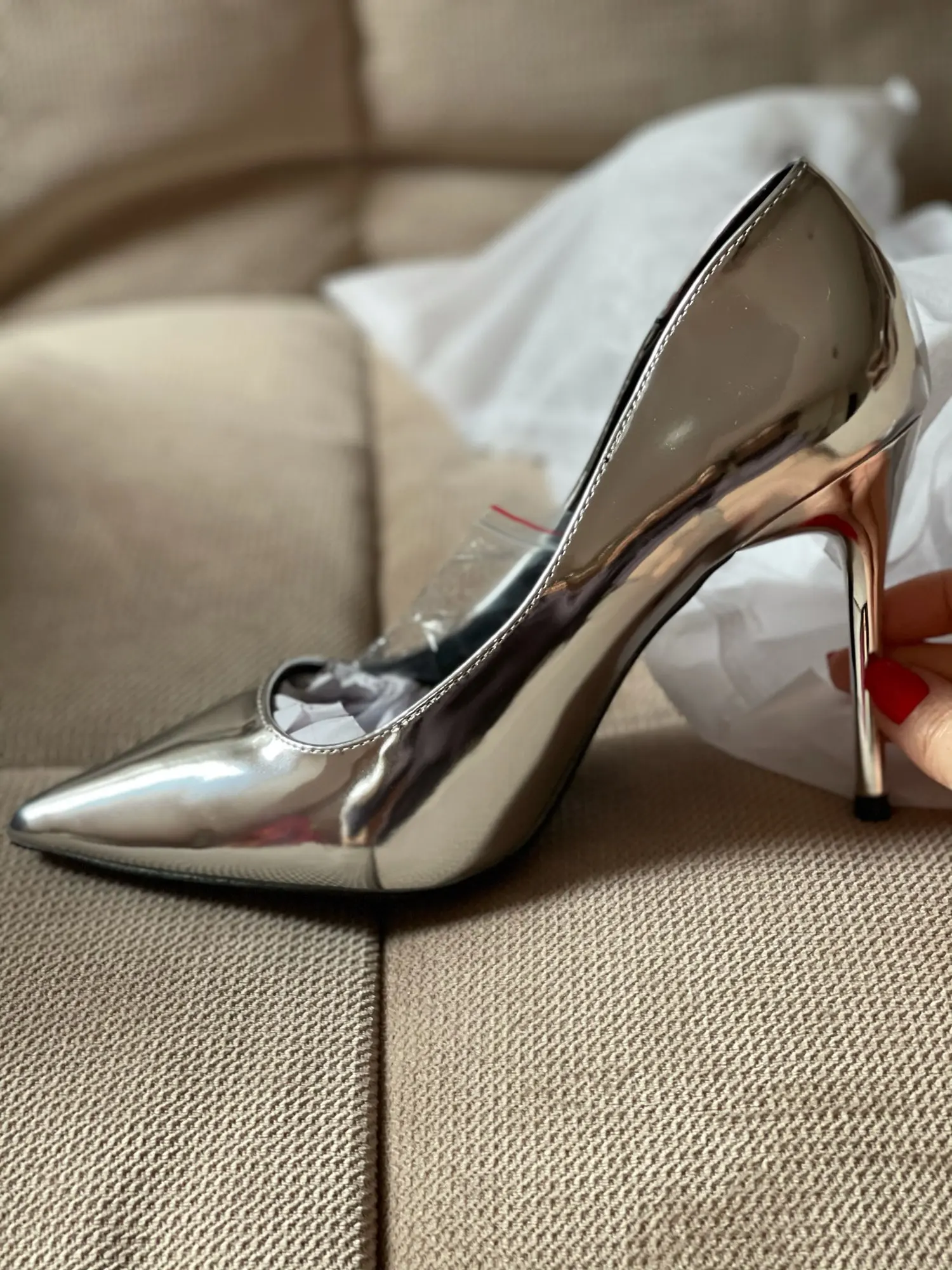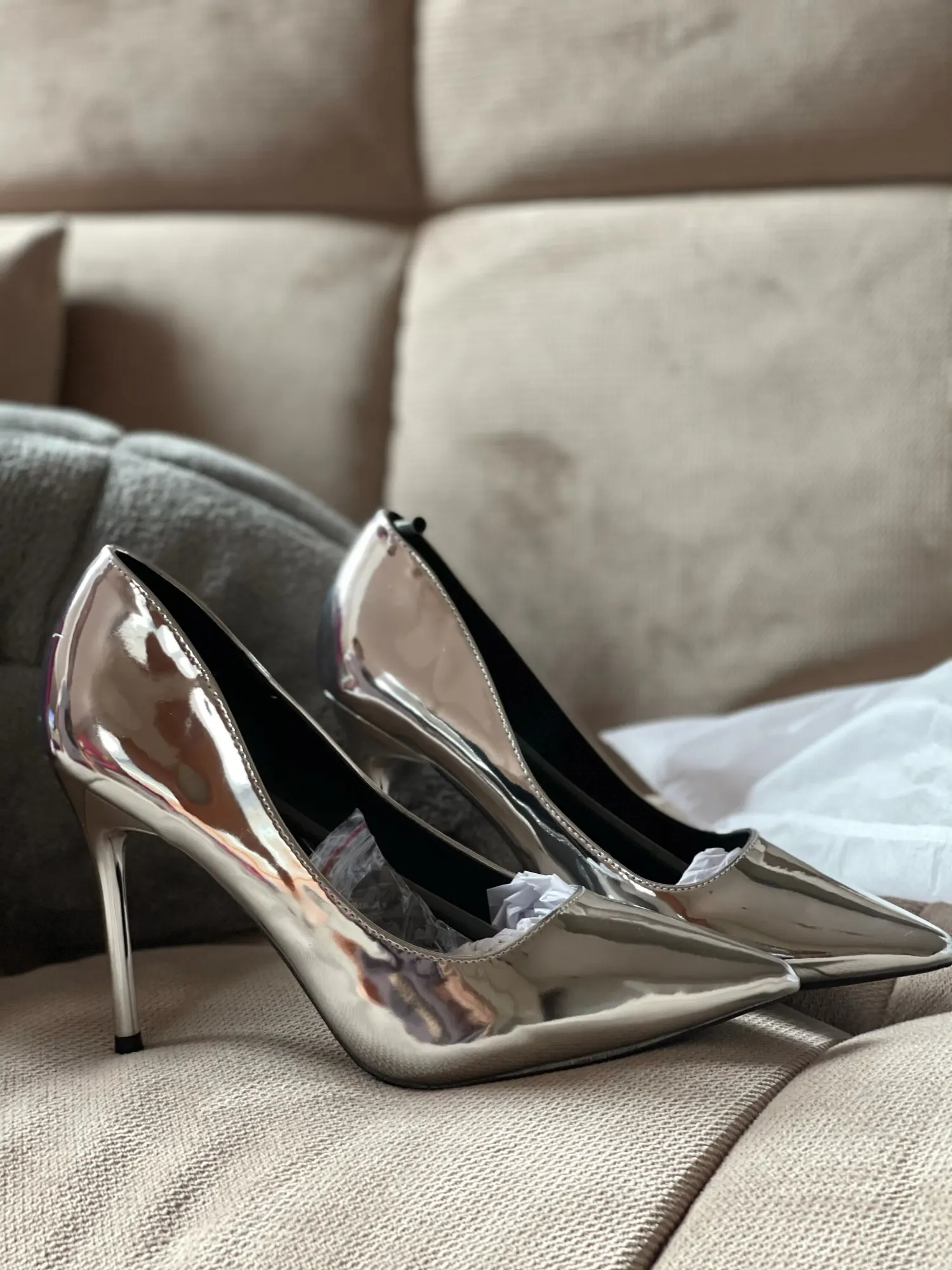 Пикантные женские туфли на шпильке, 2020 блестящие золотистые туфли из лакированной кожи, женские свадебные туфли с металлическим серебристым носком насосы