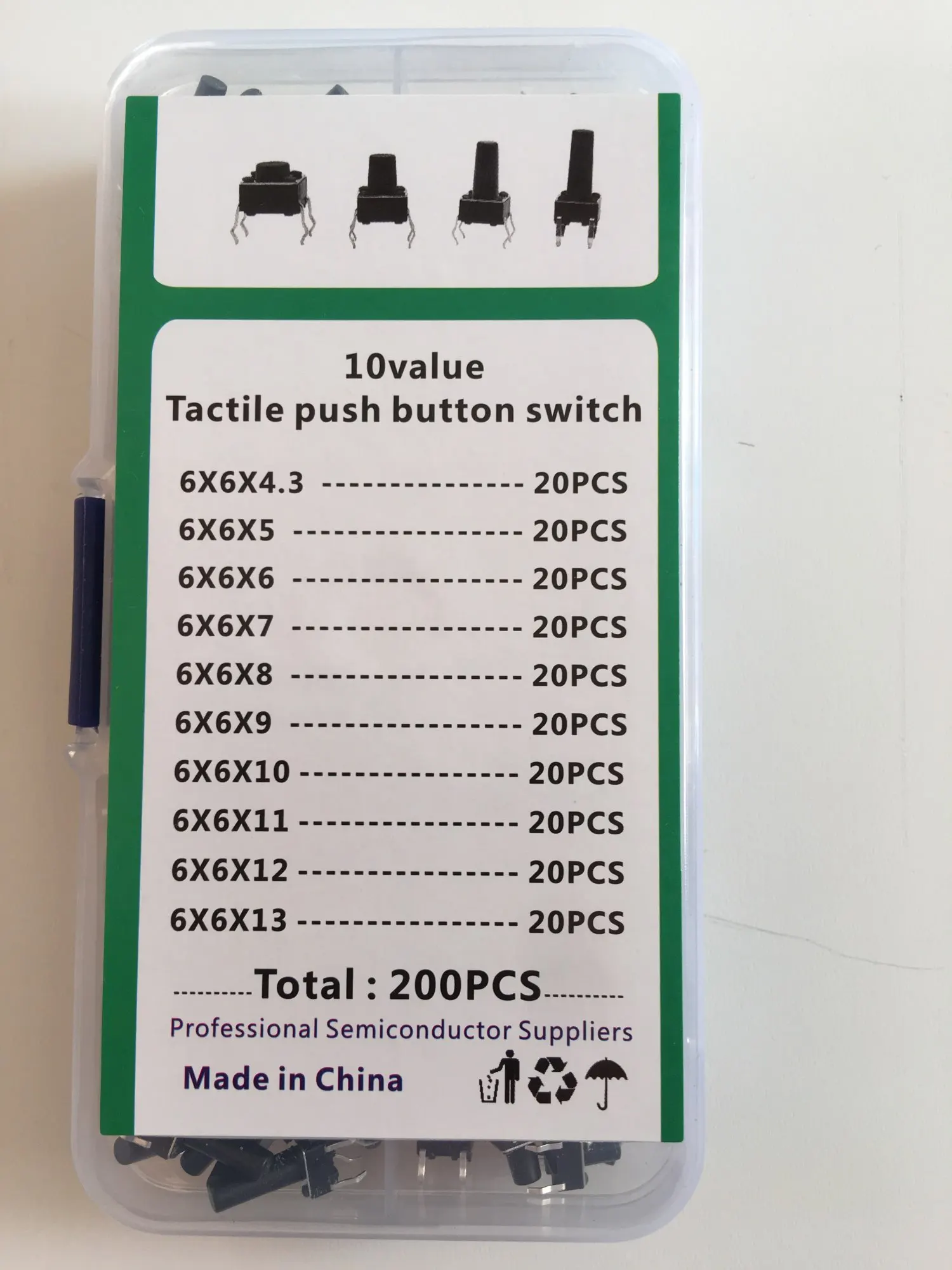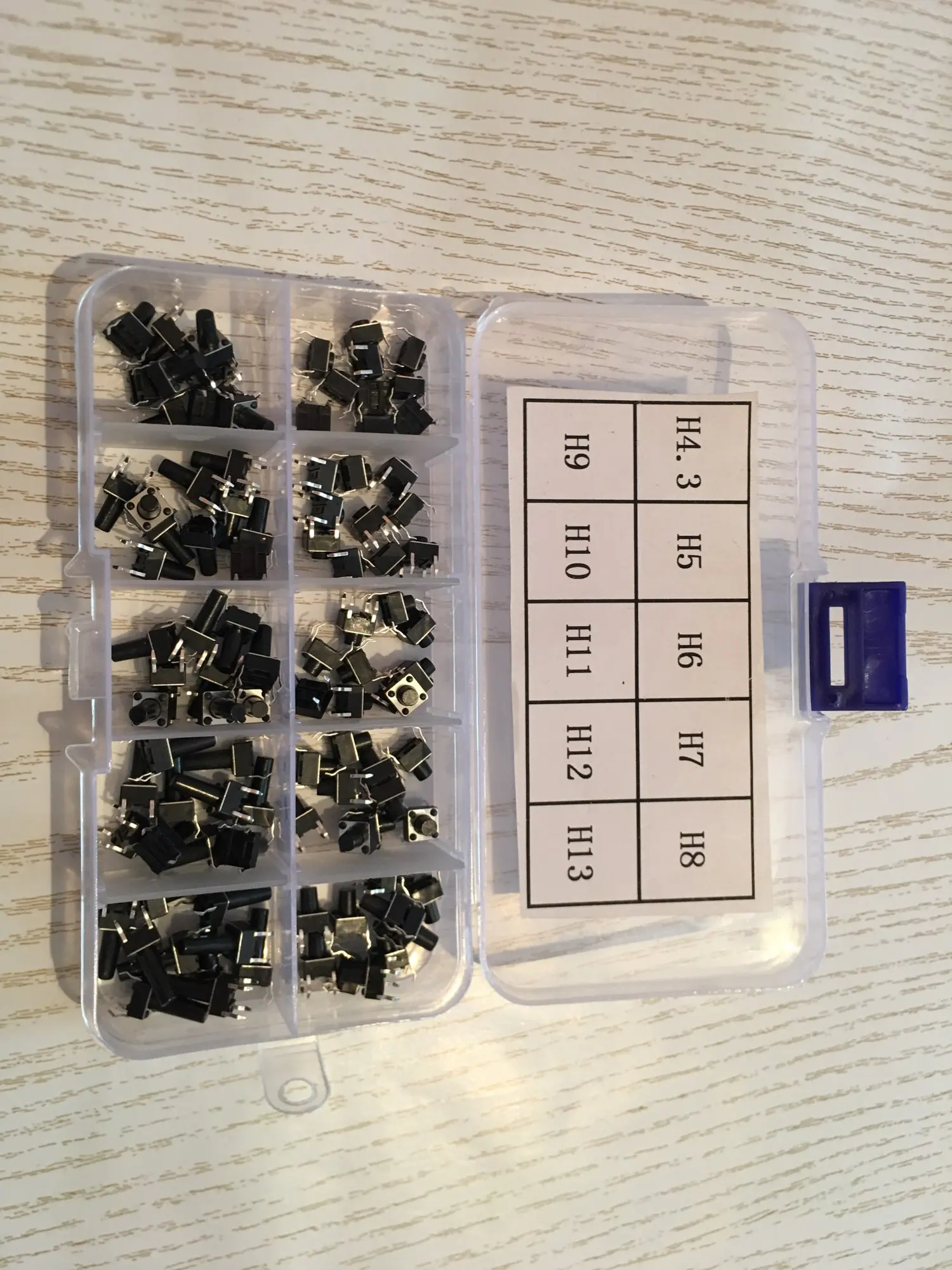 Набор микросенсорных переключателей 6*6, 100 шт.10 моделей, наборы кнопочных переключателей, высота: 4,3-13 мм, DIP, 4 контакта, 6x6 кнопок, тактовое включениевыключение