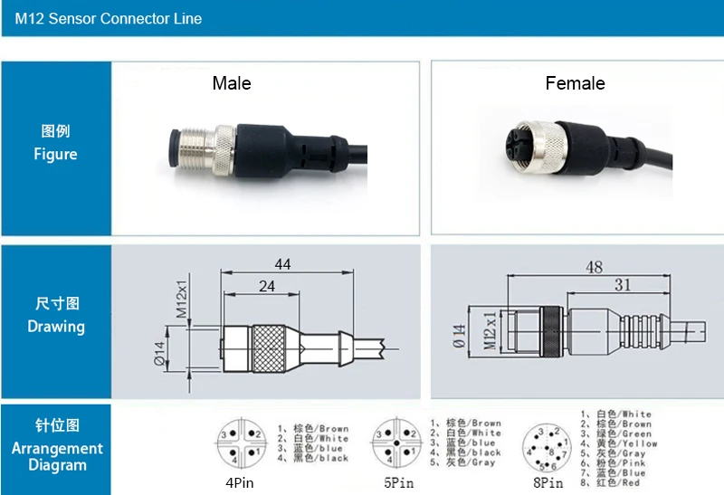 M12 кабель для подключения датчика с двойной головкой, 2 м, 4-контактный, 5-контактный, 8-контактный
