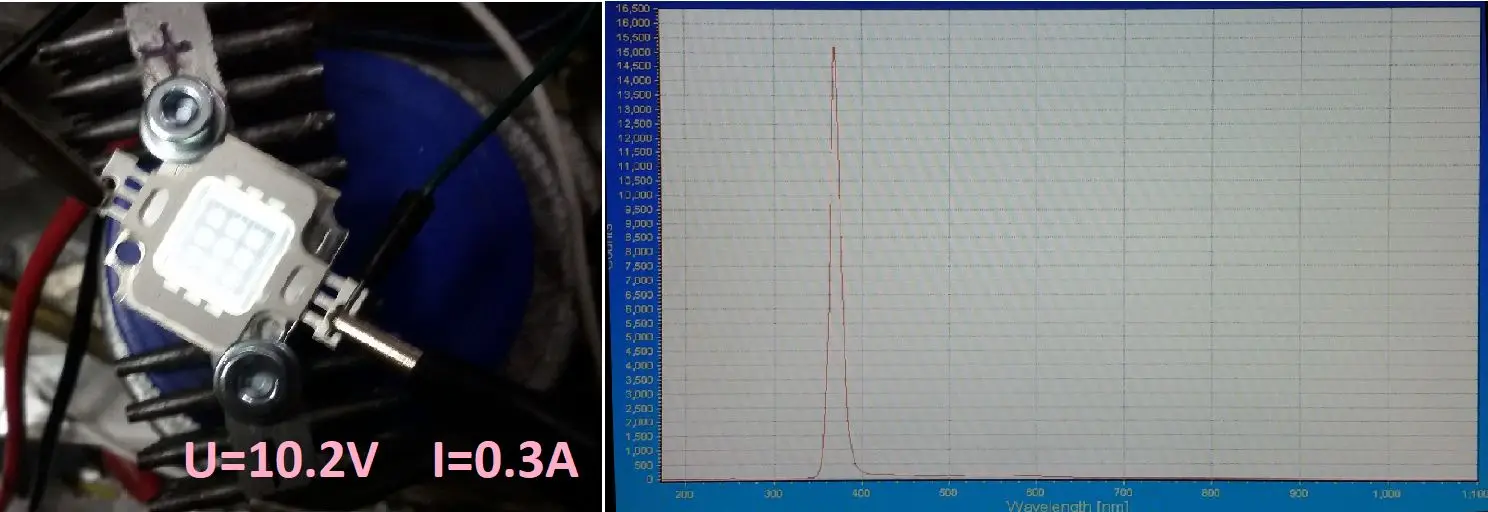 Этот УФ-светодиод COB является белым и не выступает в качестве длины волны 365nm, которую я использую в сравнении. УФ-эффект отсутствует.