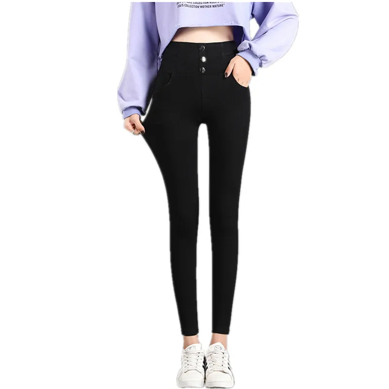 Брюки-карандаш женские с завышенной талией, черные однотонные облегающие леггинсы на 3 пуговицах, повседневные штаны на осень, P8348, 2021
