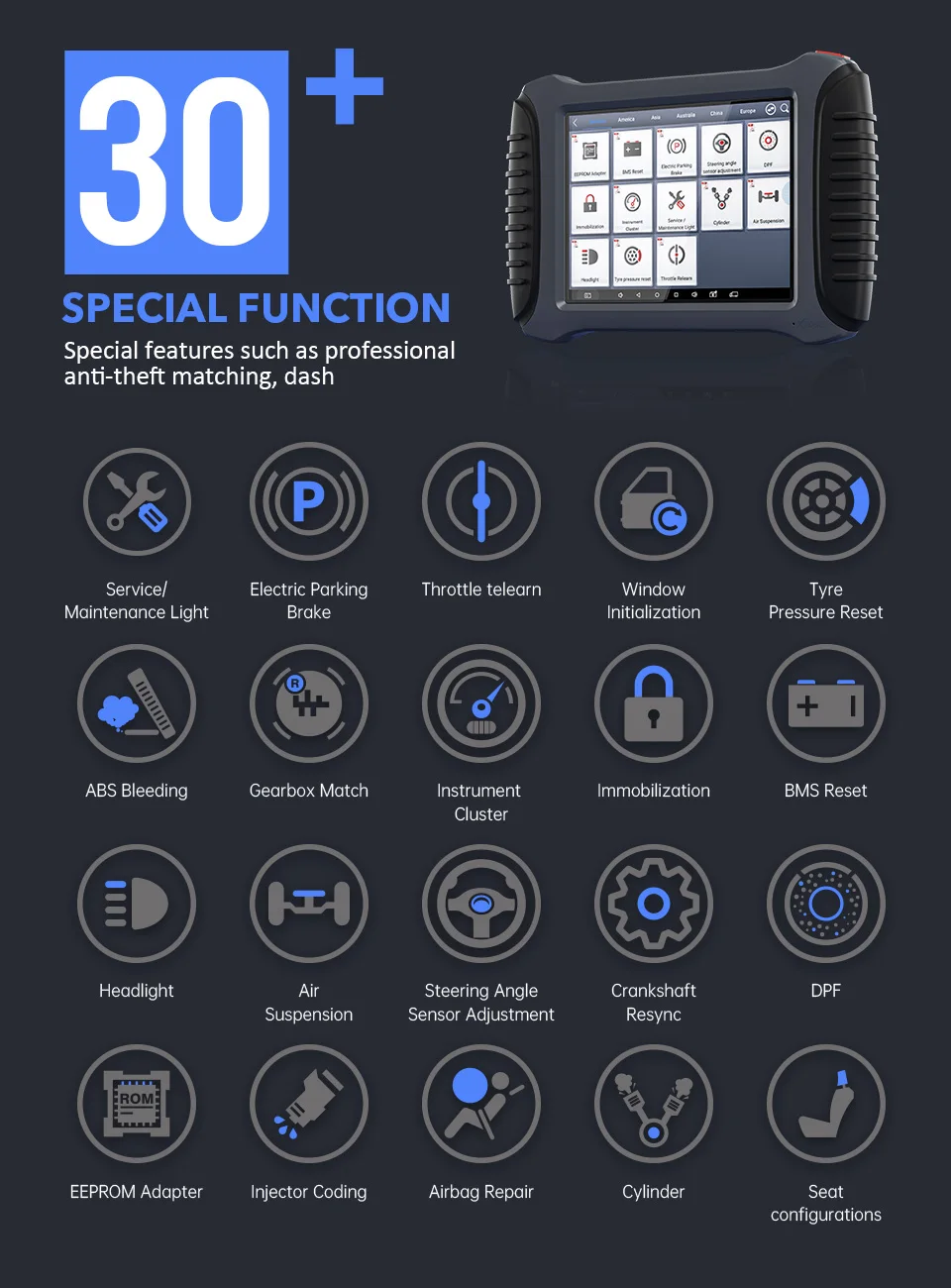 Сервисные функции для различных запланированных работ по обслуживанию и обслуживанию, включая: сброс масла, EPB, TPMS, BMS, тормозное отверстие, DPF, Immo ключи, инжектор, SAS, подвеска, дроссельная заслонка, крыша WIN DR, сиденья, приборный блок, изменение Lang, фары, обучение шестерни, ABS/SRS, цилиндр, турбозарядка, предел, Сцепление, адаптер EEPROM, сброс подушки безопасности.Наиболее часто Выполняемые функции обслуживания включают:Услуга сброса масла:Позволяет выполнить сброс срока службы моторного масла, который рассчитывает оптимальный интервал изменения срока службы масла в зависимости от условий вождения автомобиля и климата.Сервис EPB:Помогает поддерживать электронную тормозную систему безопасно и эффективно, деактивация и активация системы управления тормозом, помощь в управлении тормозной жидкостью, открытии и закрытии тормозных колодок, а также установка тормозов после замены дисков или колодок и т. д.SAS сервис:Позволяет проводить калибровку датчика угла поворота рулевого колеса, который постоянно сохраняет текущее положение рулевого колеса как прямое положение в датчике угла поворота рулевого колеса EEPROM.Услуги DPF:Позволяет выполнять многочисленные функции системы дизельного фильтра твердых частиц.Услуги TPMS:Позволяет быстро найти идентификаторы датчиков шин из Эбу автомобиля, а также выполнить Программирование TPMS и процедуры сброса после замены датчики давления в шинах.IMMO сервис:Программирует новый ключ от кражи и выполняет сопоставление ключей при замене переключателя зажигания, комбинированной приборной панели, ECU, BCM или батареи пульта дистанционного управления.И многое другое…