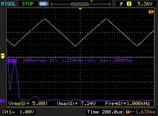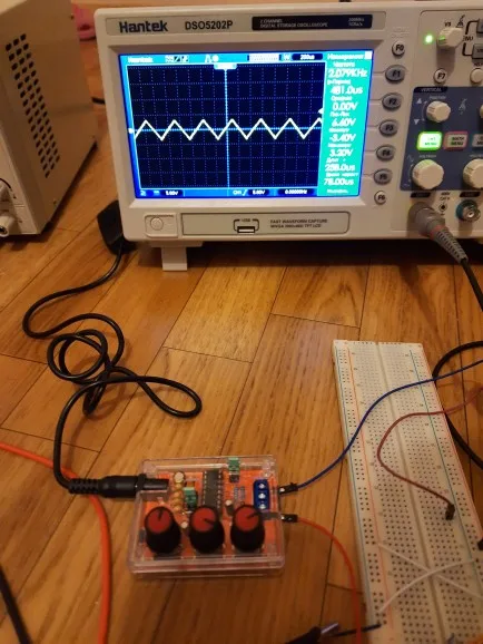 Он работает очень хорошо, следует ясно, что хотя Максимальная фактическая частота выхода составляла 145 кГц, я очень доволен его производительностью. В треугольном волне вы должны отрегулировать усиление, чтобы не потерять цепи.