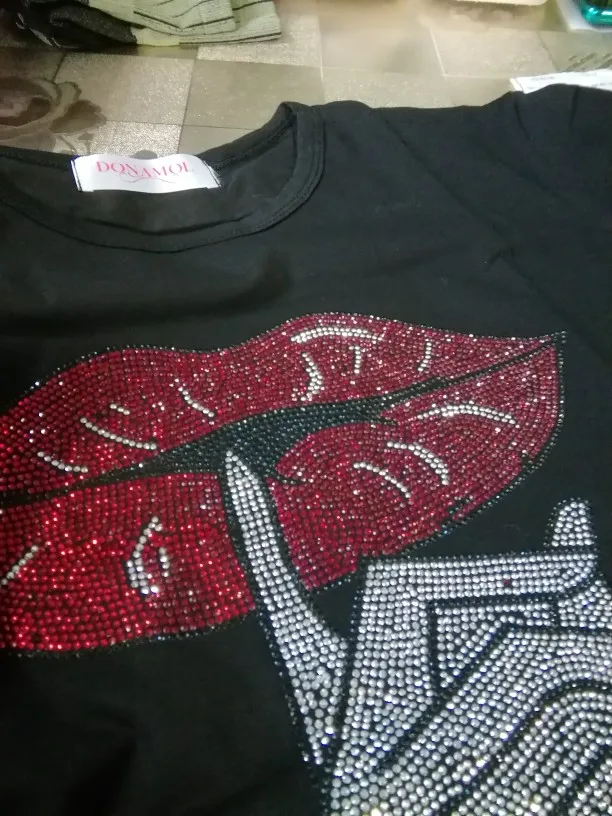 Очень хорошая футболка, такая в Москве раза в 3 дороже, вся в камнях, примерно как стразы, но более качественные каменюки, мелкие, поэтому смотрится единым рисунком, вся переливается, рисунок крупный, материал типа вискозы с хлопком на ощупь, на свой размер 52-54 села идеально без гусеницы сзади , после стирки в машинке ,не села, камни не отлетели, швы по бокам не деформировались, ношу все лето не снимая, на удивление отличное качество.