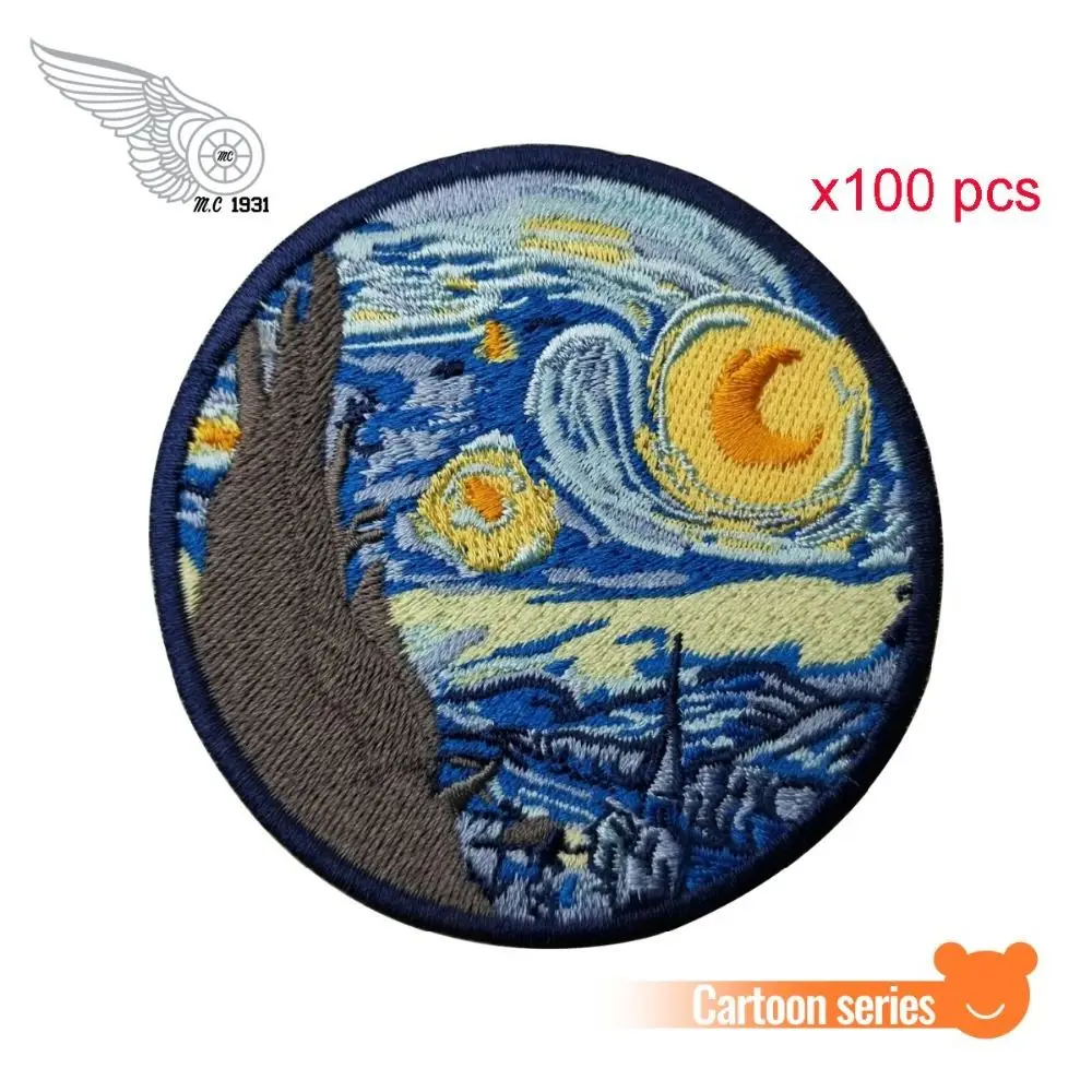 Оптовая продажа, 8 см в ширину, вышитые нашивки с изображением звездной ночи Ван Гога, 100 шт. в комплекте для одежды
