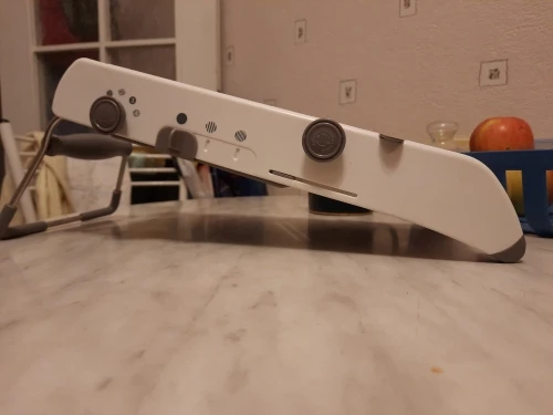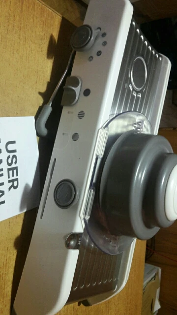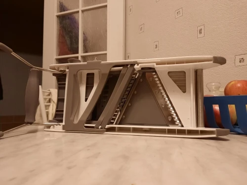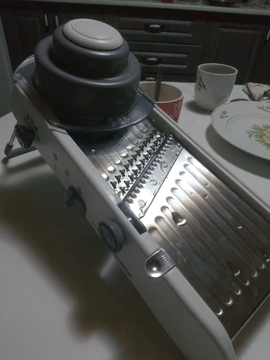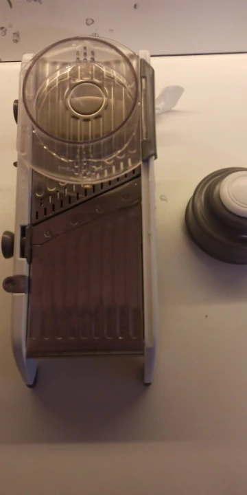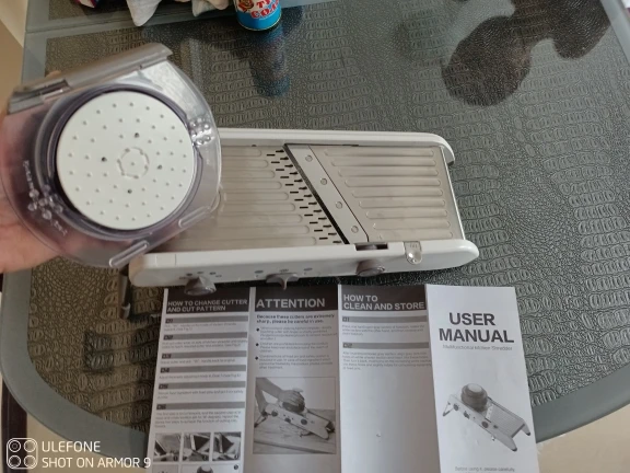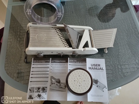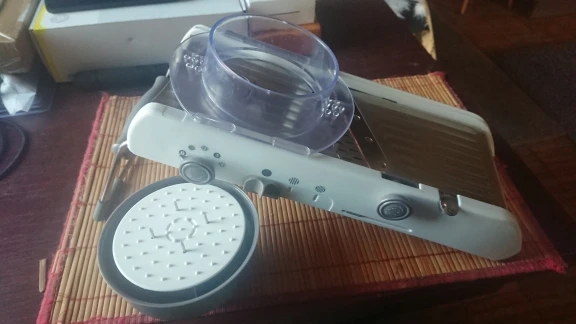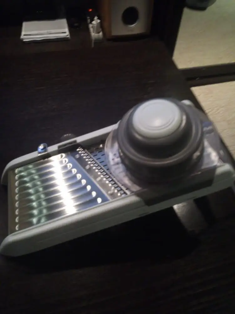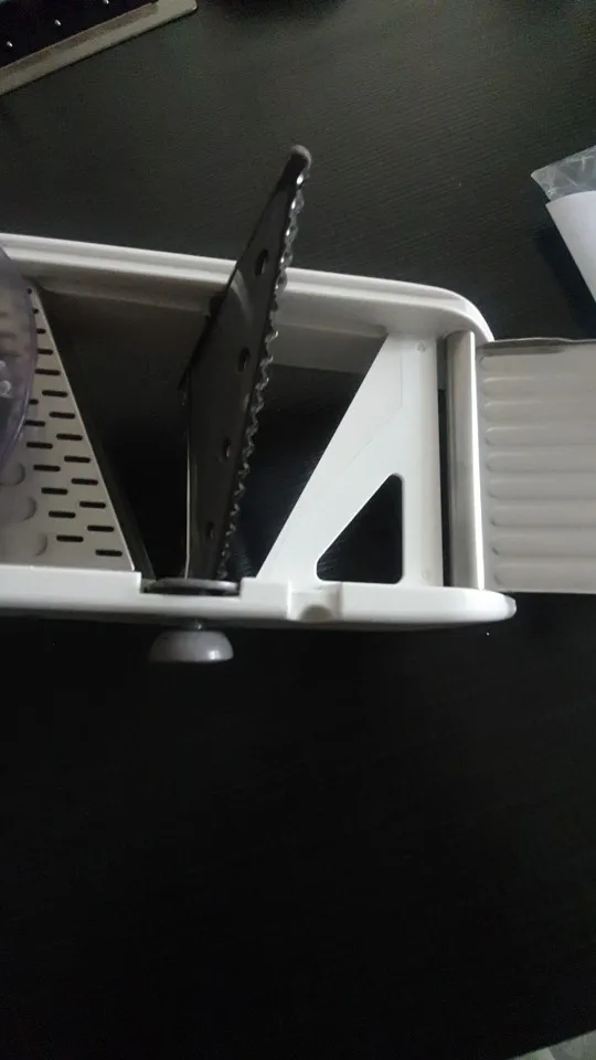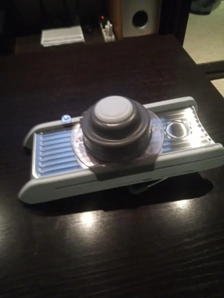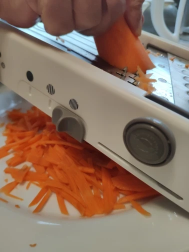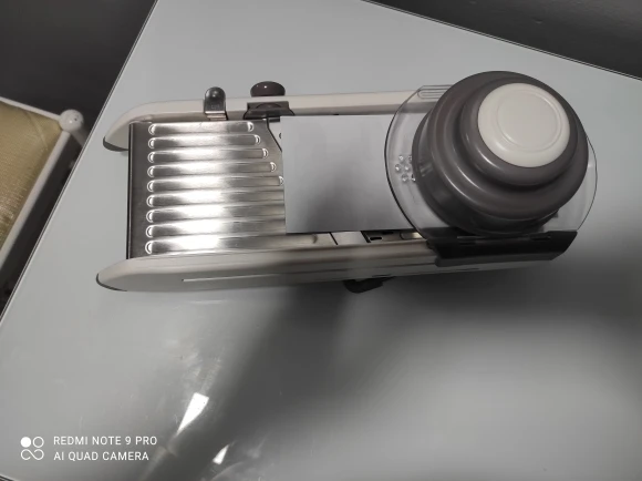 Хорошая ломтерезка. Прочные материалы. Острые ножи. Простой в использовании и безопасный для рук. Уже Протестировано на морковь. Белая часть ломтерезки после того, как морковь в некоторых местах имеет светло-красный оттенок. Легко изменить форму нарезки.