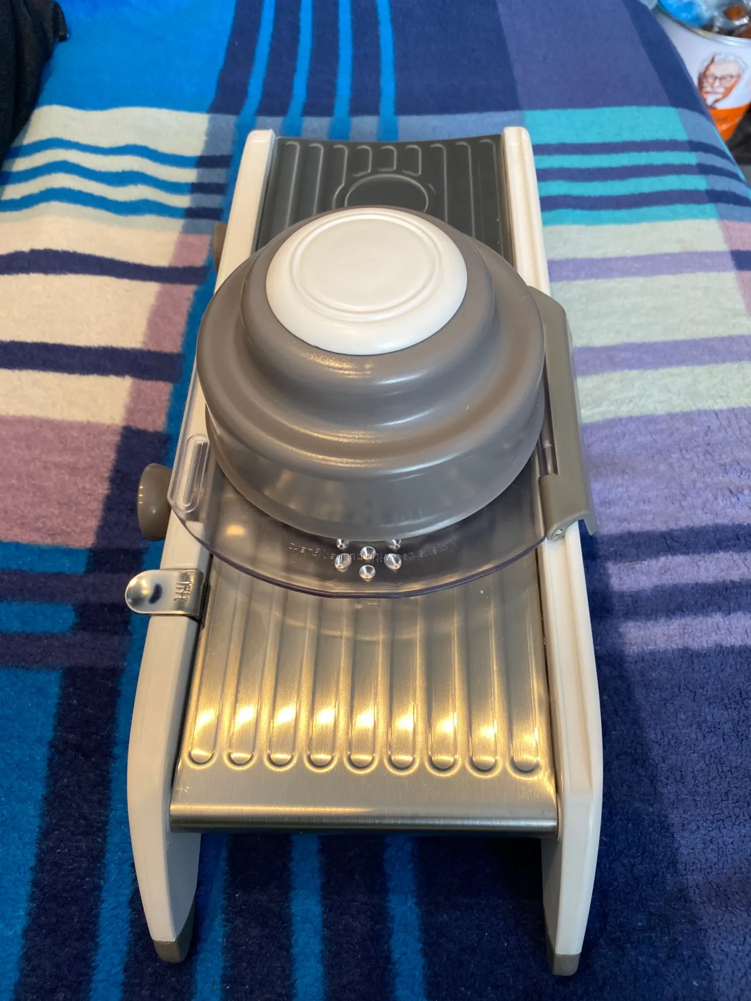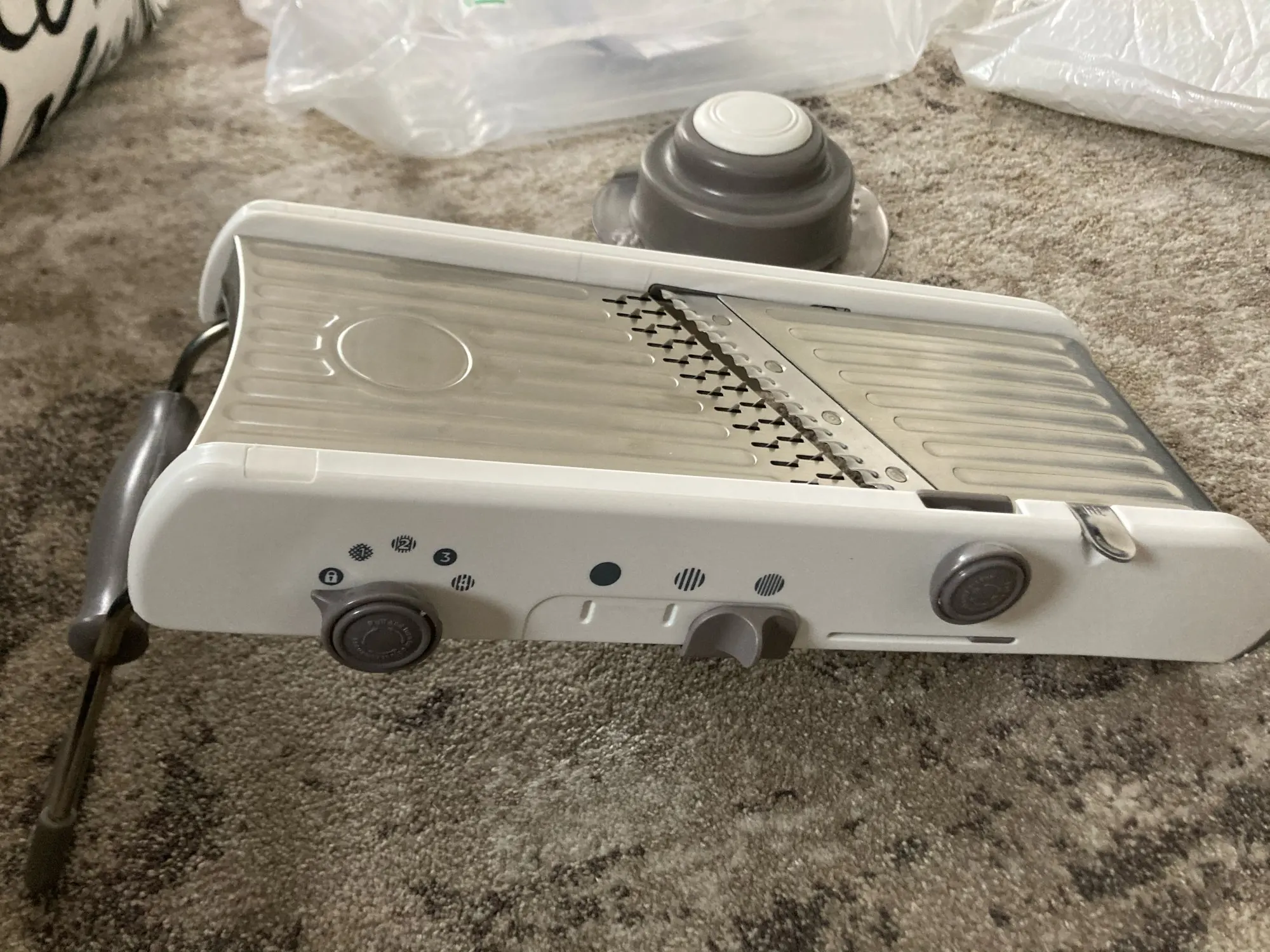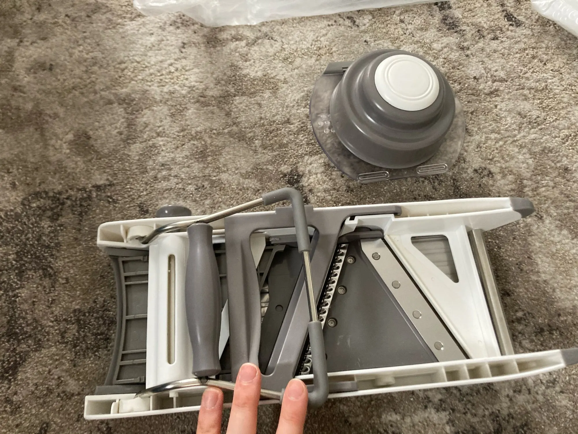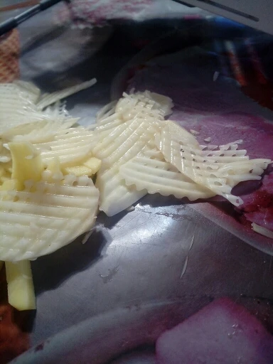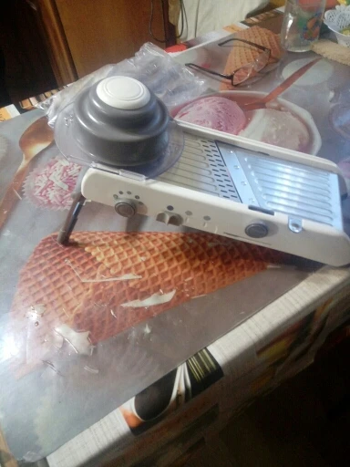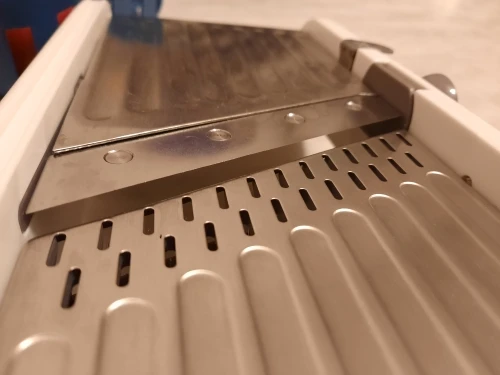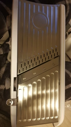 Хорошая ломтерезка. Прочные материалы. Острые ножи. Простой в использовании и безопасный для рук. Уже Протестировано на морковь. Белая часть ломтерезки после того, как морковь в некоторых местах имеет светло-красный оттенок. Легко изменить форму нарезки.