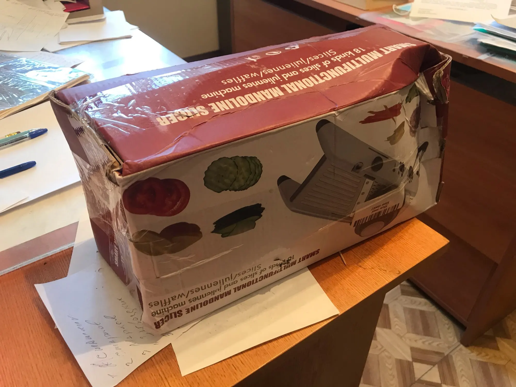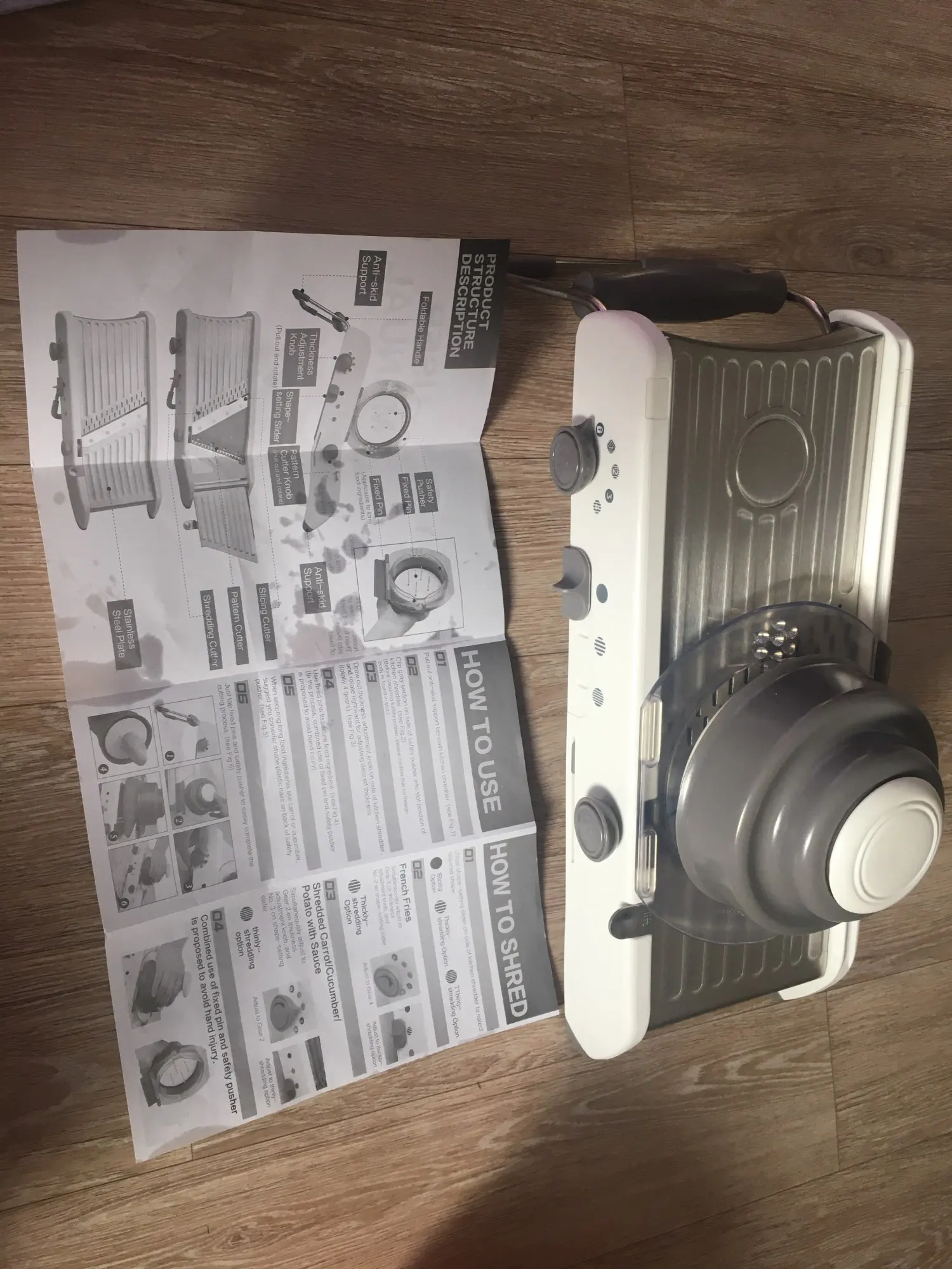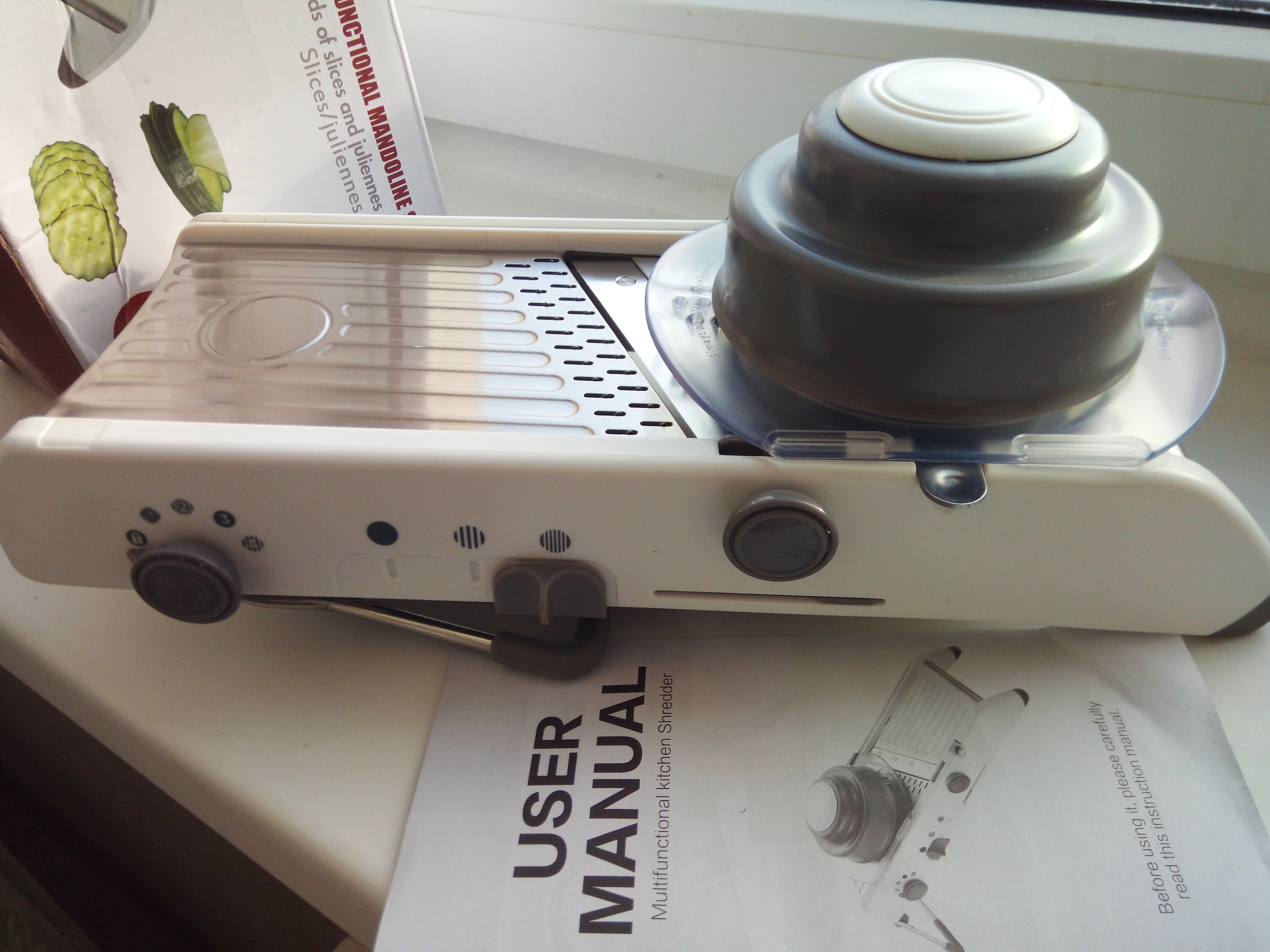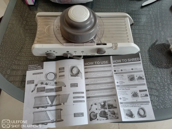 Посылка пришла достаточно быстро, в коробке с инструкцией на английском языке. Разобраться достаточно легко. Удобная,опробовал на картофеле, хотел фри приготовить. Хорошо шикует правда не до конца. А так добротная, достаточно массивная и крупная. Покупкой доволен, хороший подарок на новый год ☺