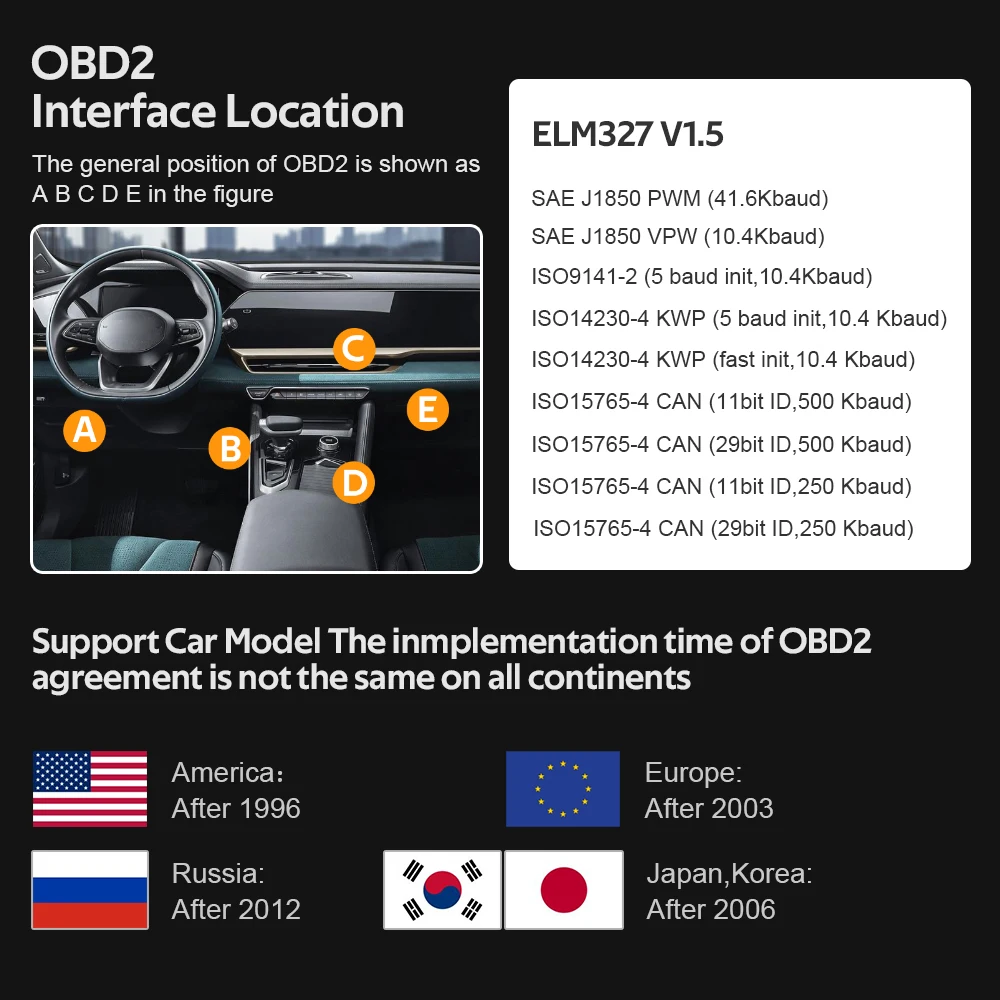 2004 или более новый модельный год, автомобиль, сделанный в Европейском союзеПодходит для Alfa Romeo, подходит для SAAB, подходит для Acura, подходит для Opel, подходит для Audi, подходит для Seat, подходит для Peugeot, подходит для Renault после 2009 года, не поддерживает Clio 2Подходит для Bentley, подходит для Skoda, подходит для Daewoo, подходит для Benz, подходит для Daihatsu, подходит для Land RoverПодходит для BMW, подходит для Vauxhall, подходит для Citroen, подходит для Volvo, подходит для Fiat, подходит для VW, подходит для Ford, подходит для Jaguar2008 или более новый модельный год, автомобиль, сделанный в азиатском союзеПодходит для KIA, подходит для Isuzu, подходит для Honda, подходит для Mitsubishi, подходит для Hyundai, подходит для Dacia, подходит для Lexus, подходит для MazdaПодходит для Nissan, подходит для Subaru, подходит для Suzuki, подходит для Toyota