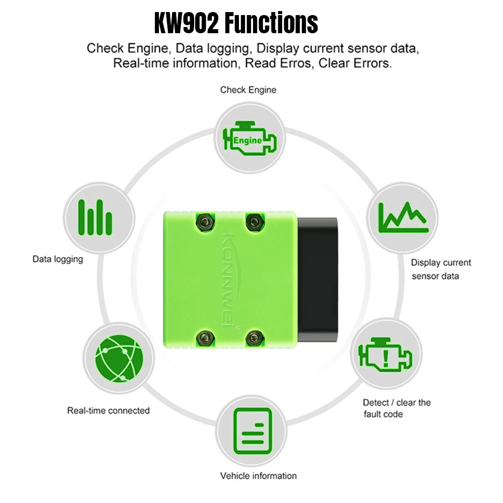 KONNWEI KW902 Bluetooth ELM327 V1.5 чип PIC18f25k80 OBDII считыватель кодов ELM 327 Диагностический инструмент работает на Android ПК 16Pin kw 902