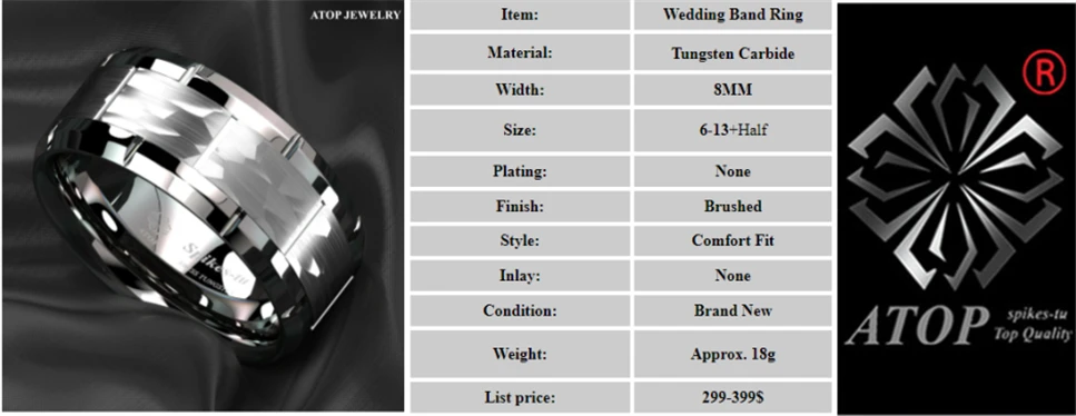 Мужское кольцо из вольфрама ATOP, обручальное кольцо 8 мм с матовой...