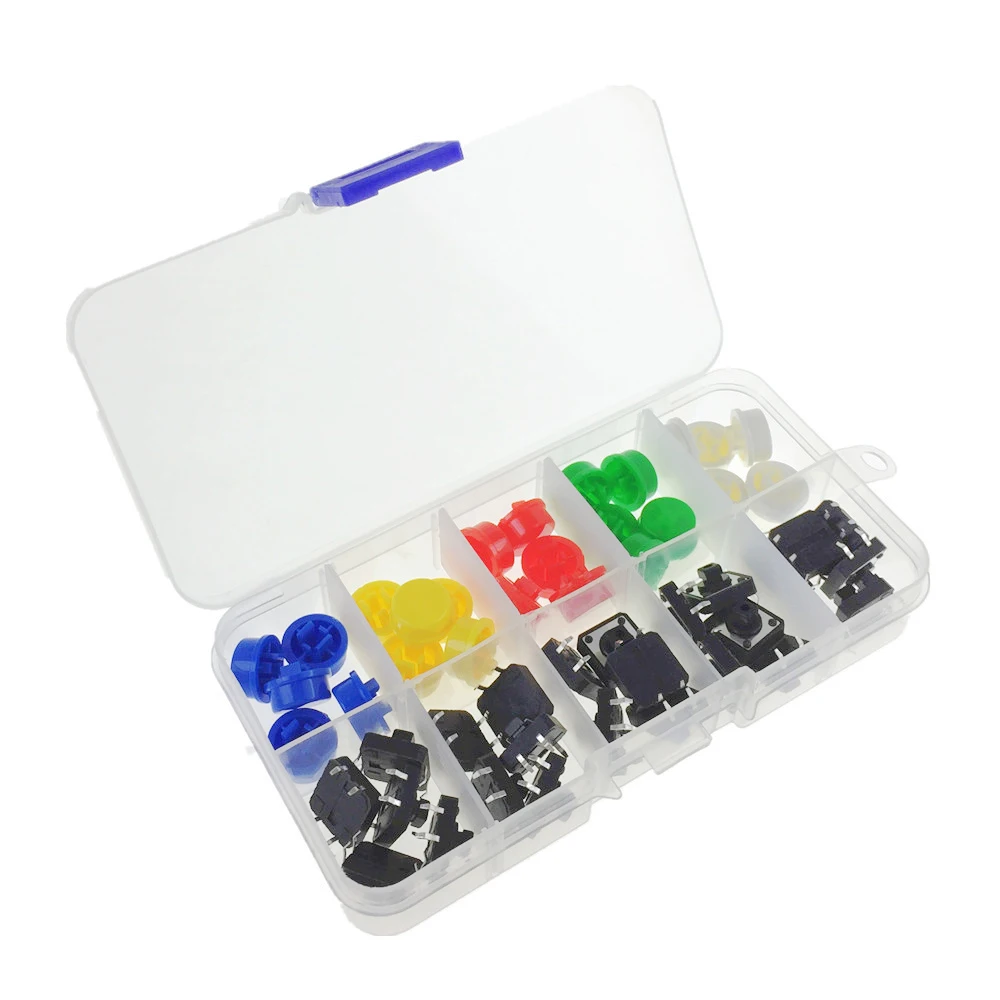 Тактильный кнопочный переключатель, 25 шт, мгновенный 12*12*7.3 мини-выключатель Кнопка + 25 шт тактовых колпачков (5 цветов) в пластиковой коробке