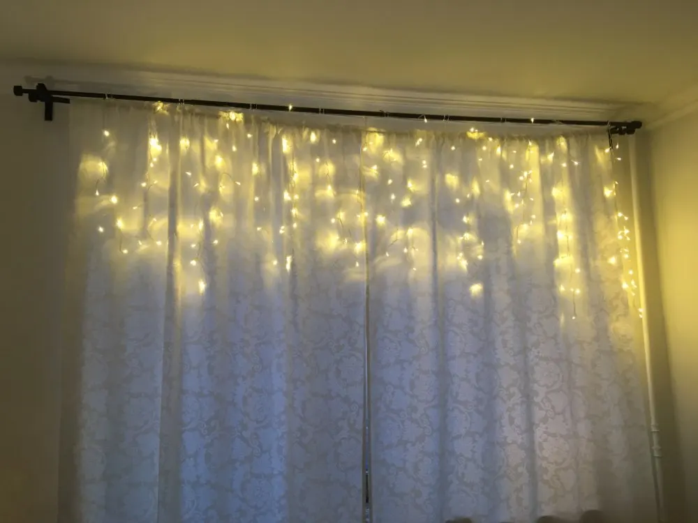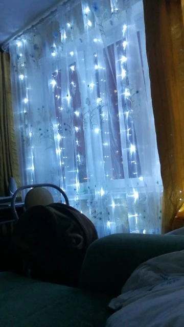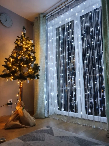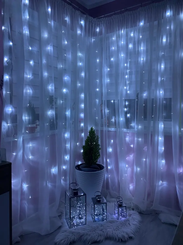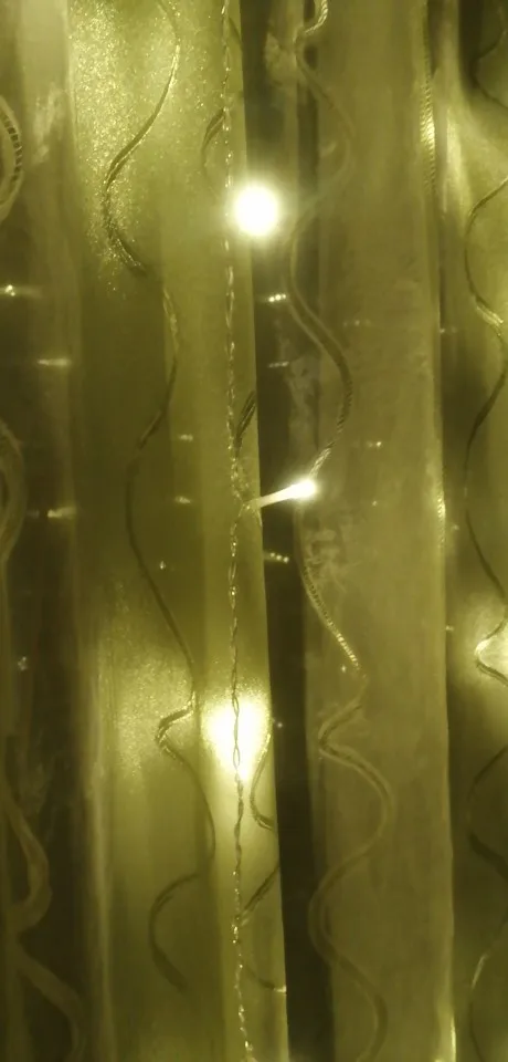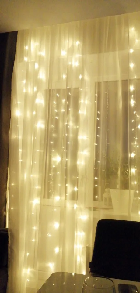 Пришло в начале декабря, заказала 11.11. Доставка до Краснодара. Сразу в одном пакете и удлинитель и гирлянда. У нас выход на балкон с этого окна, поэтому повесили на его половину. Вешали на крючки обычные для тюли. Все работает, несколько режимов, без удлинителя совсем короткий провод, будьте внимательнее, лучше сразу взять с удлинителем. У нас 2,65 окно, почти до пола получилось натянуть, сверху просто свисает, т.к. самы гирлянду растягивали не на все окно. Цвет очень яркий, вечером как светильник. Хорошая гирлянда
