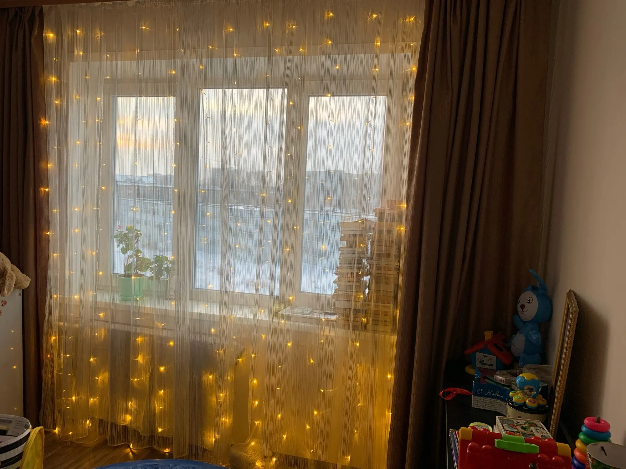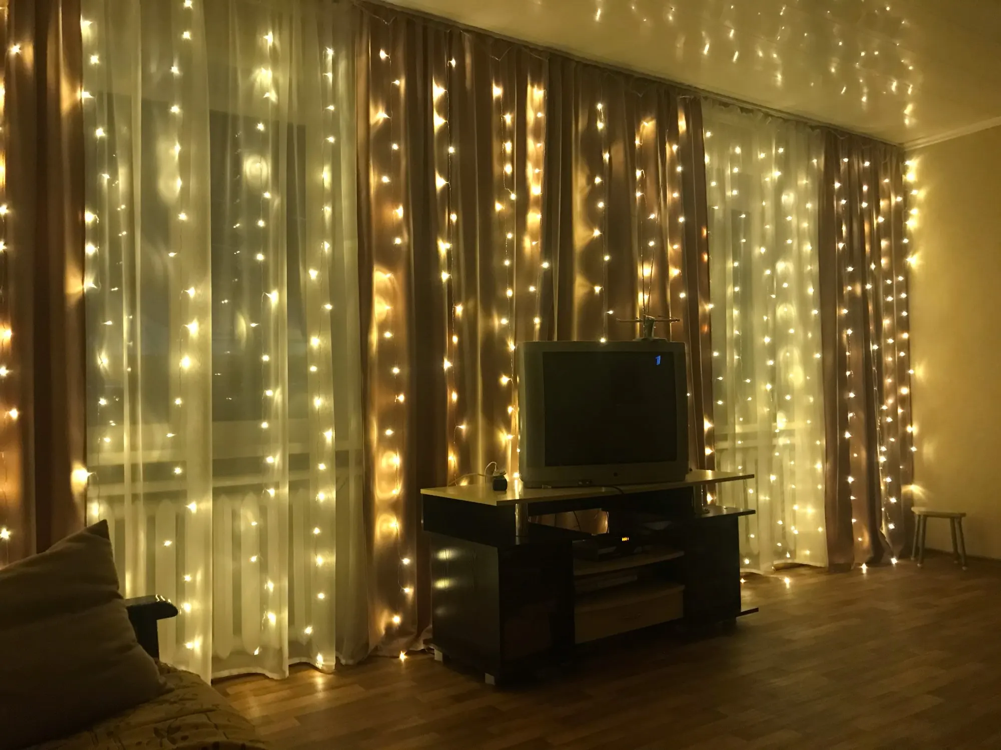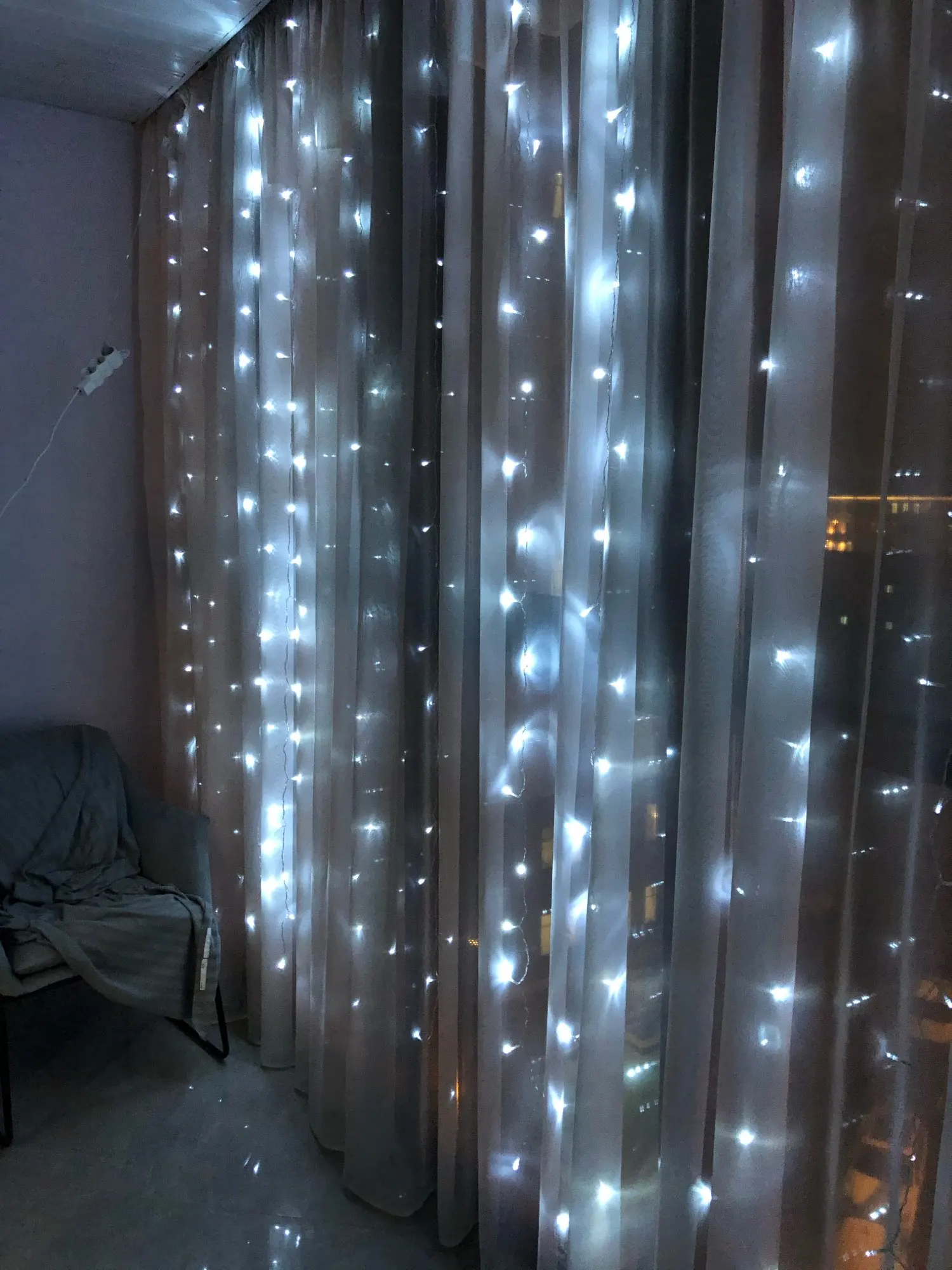 Пришло в начале декабря, заказала 11.11. Доставка до Краснодара. Сразу в одном пакете и удлинитель и гирлянда. У нас выход на балкон с этого окна, поэтому повесили на его половину. Вешали на крючки обычные для тюли. Все работает, несколько режимов, без удлинителя совсем короткий провод, будьте внимательнее, лучше сразу взять с удлинителем. У нас 2,65 окно, почти до пола получилось натянуть, сверху просто свисает, т.к. самы гирлянду растягивали не на все окно. Цвет очень яркий, вечером как светильник. Хорошая гирлянда