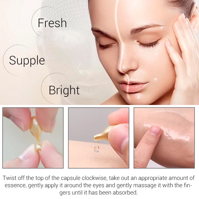 Скрутите верхнюю часть капсулы по часовой стрелке, извлеките необходимое количество эссенции, аккуратно нанесите ее вокруг глаз и аккуратно массируйте пальцами, пока она не впитывается.