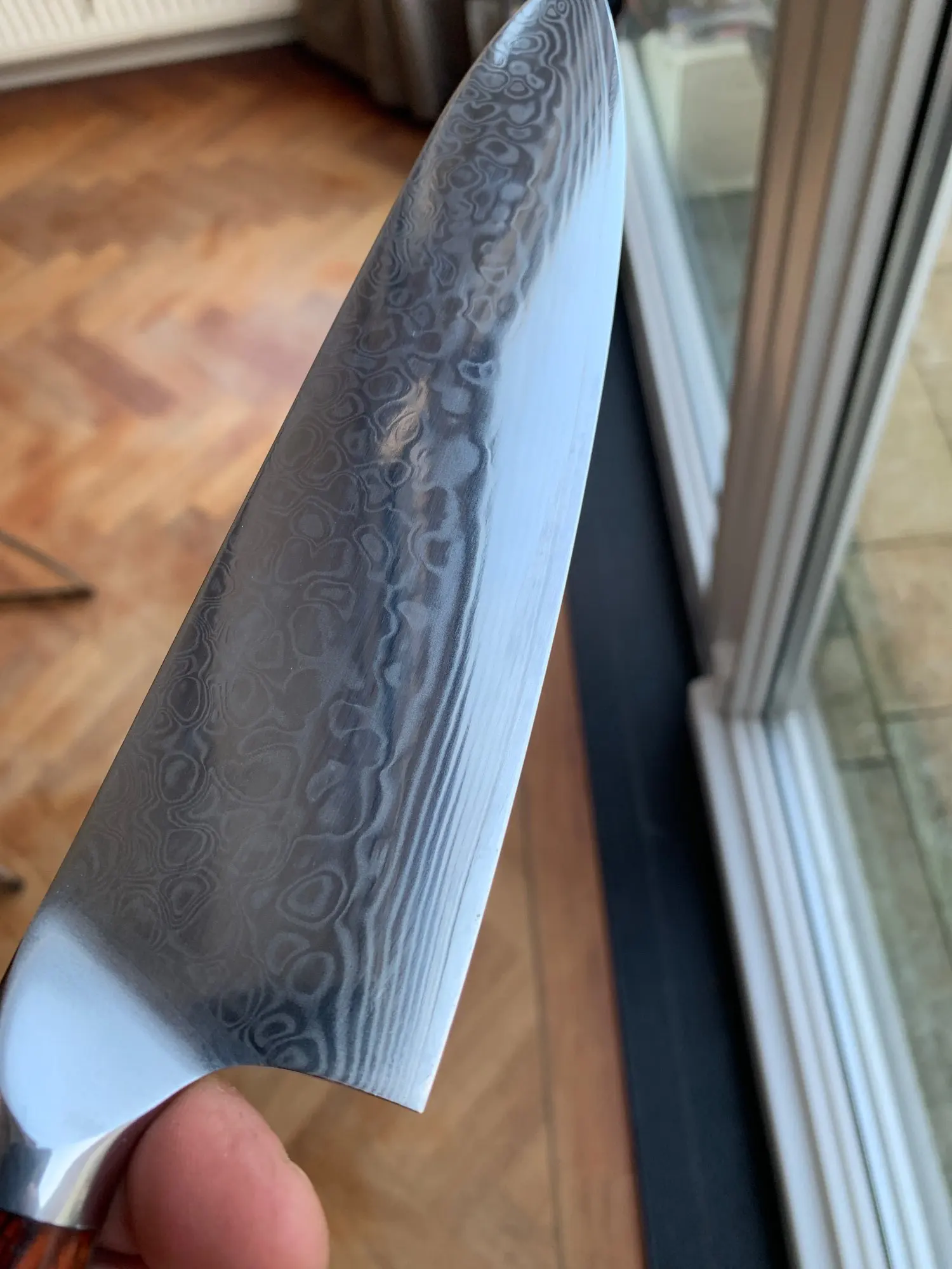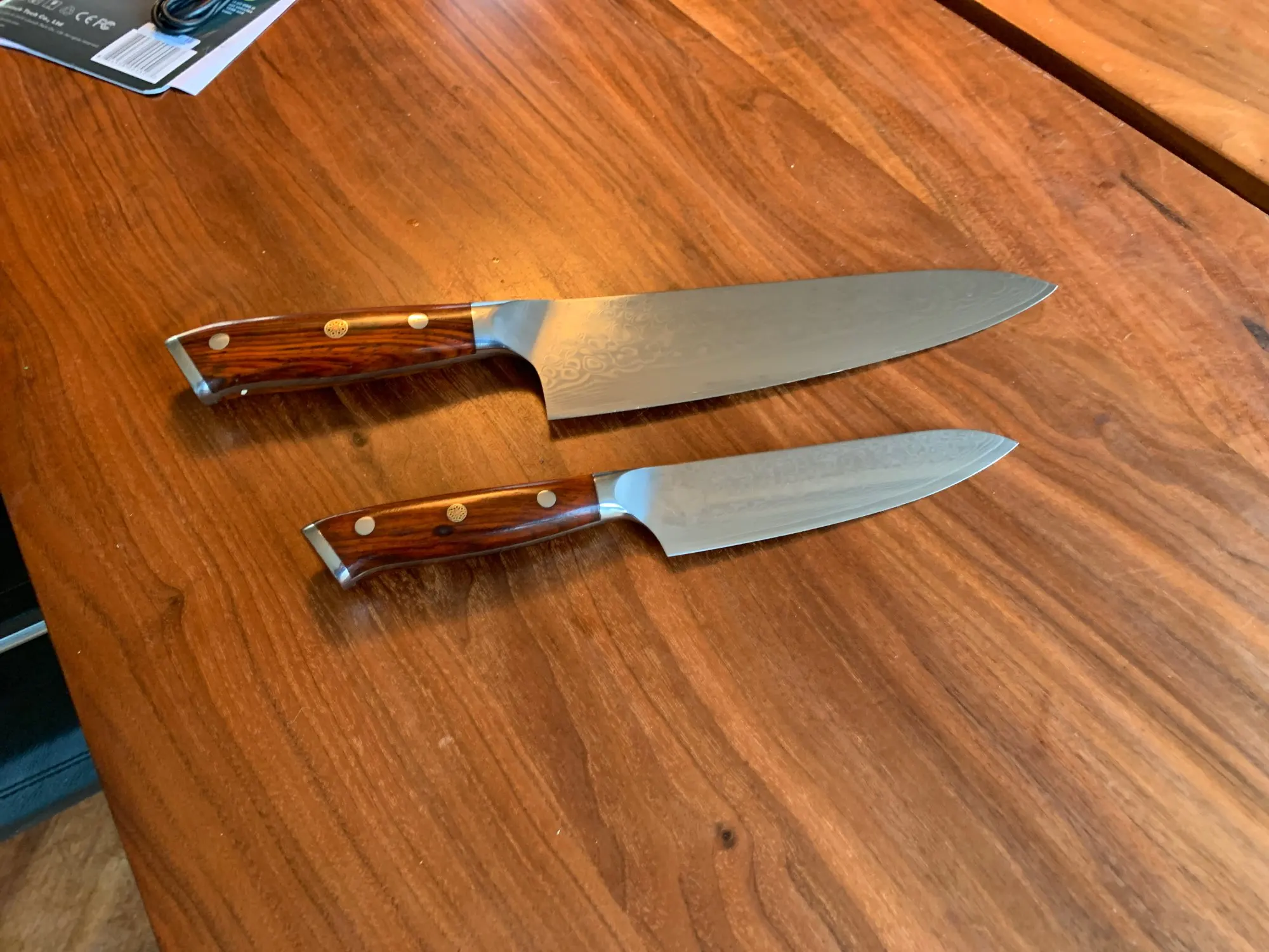 Очень высококачественные кухонные ножи. Очень остро. Хорошо сбалансирован в руке. Для легкой резки. Узор из дамаста не очень заметен. Не как черные и металлические слои .. Лезвие тонкое, но имеет некоторый вес. На ощупь очень прочный и не гибкий. Это будут мои ножи goto (и у меня было несколько АСА серьезных поваров для хобби). Высококачественные ножи не куранты. Не дешево, а качественный продукт.