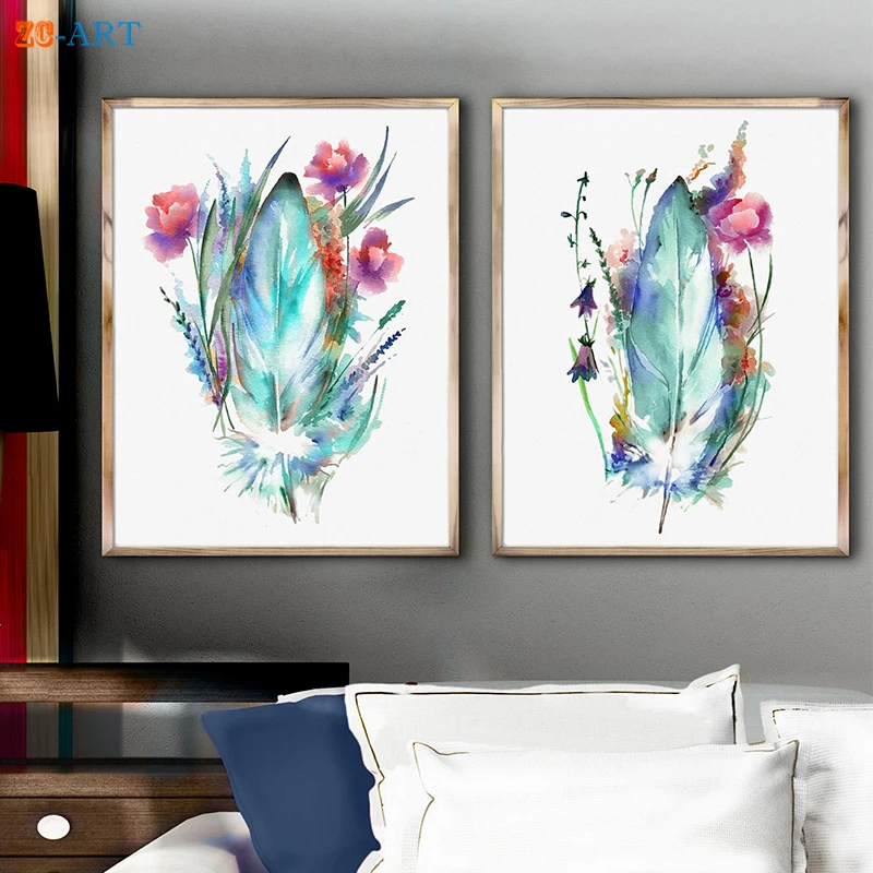 Картина с синими перьями, настенная живопись, принт для домашнего декора, картина с цветами, акварельная живопись с перьями, плакат, минималистичное искусство