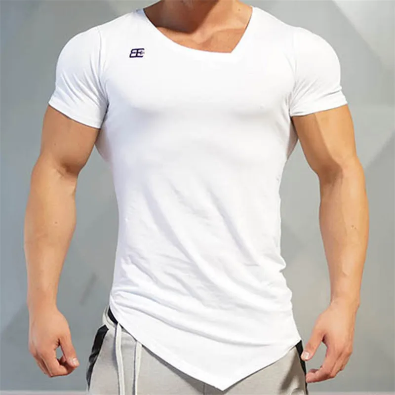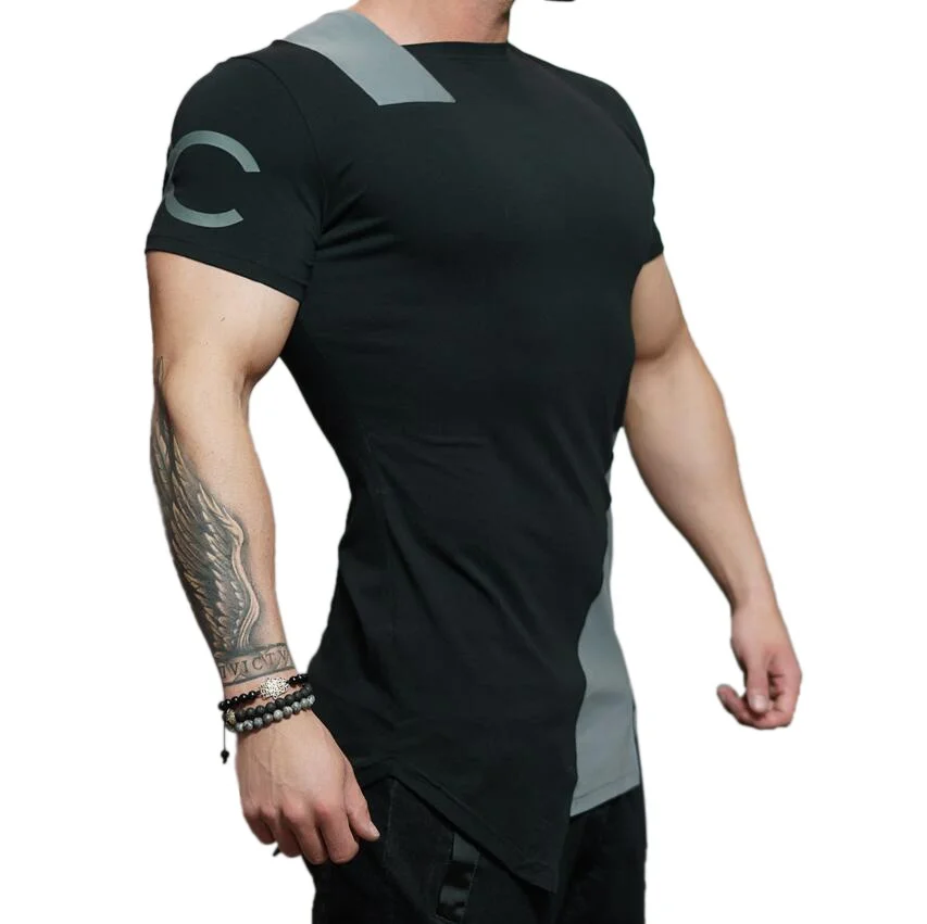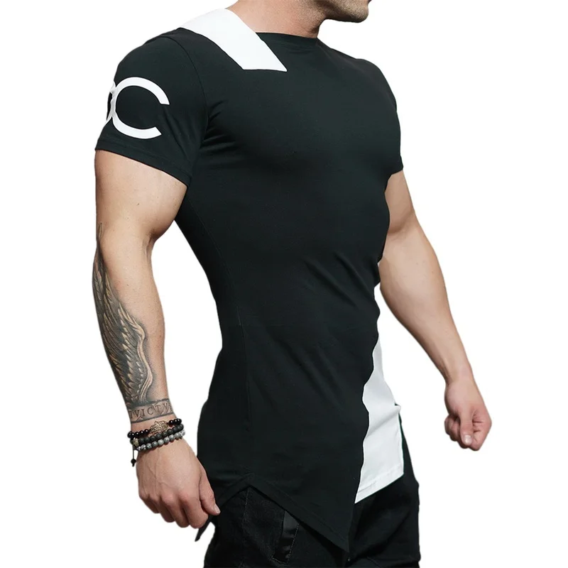 Мужская Лоскутная футболка с коротким рукавом, дышащая одежда для тренировок и бодибилдинга, рубашка для фитнеса с неровным вырезом