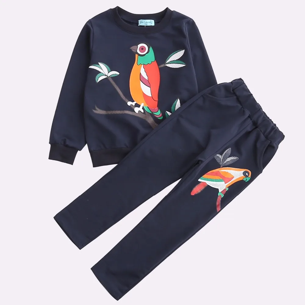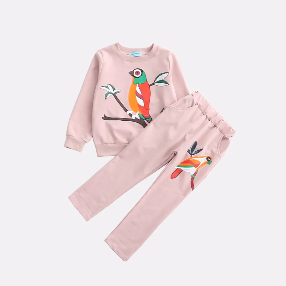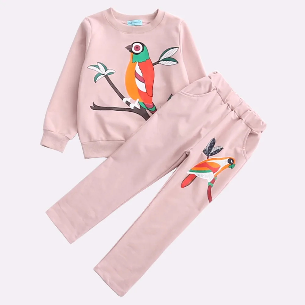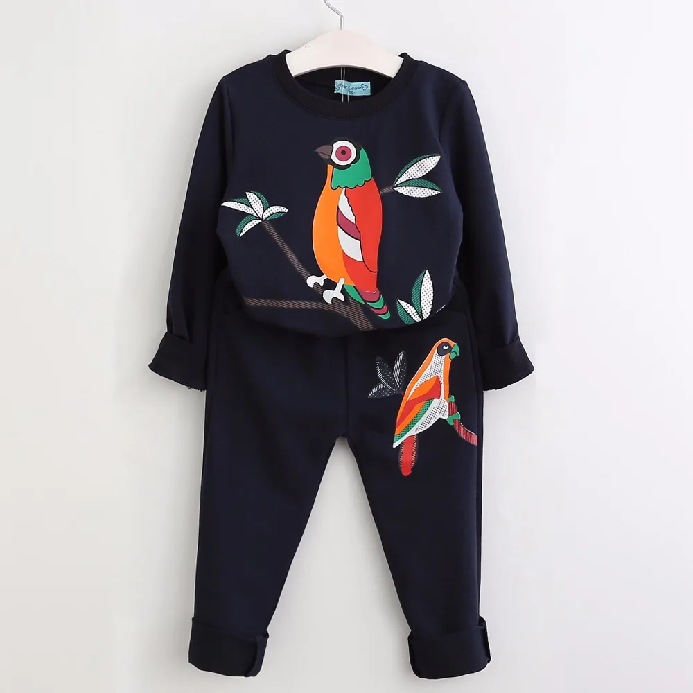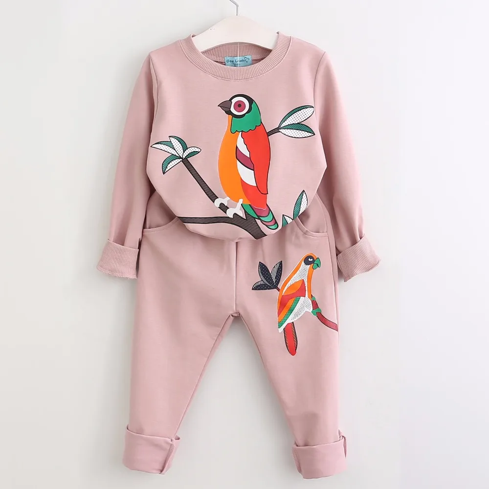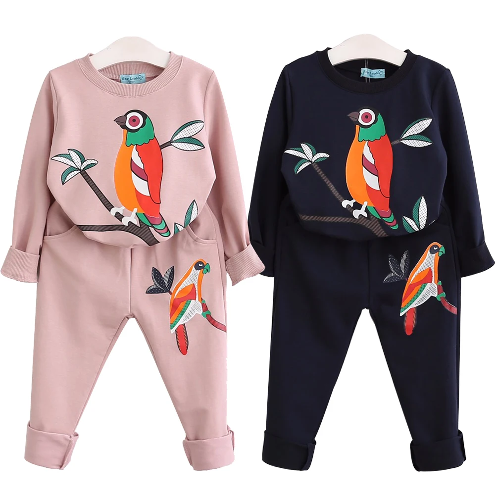 Новинка 2018, комплекты одежды для маленьких девочек на весну и осень, Детские повседневные длинные штаны с принтом птиц, свитеры, костюмы для детей, мультяшные костюмы