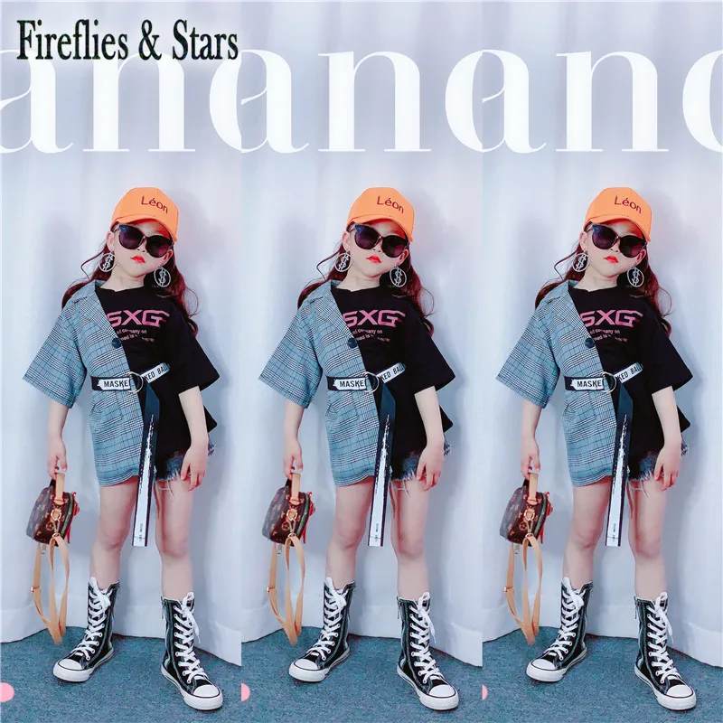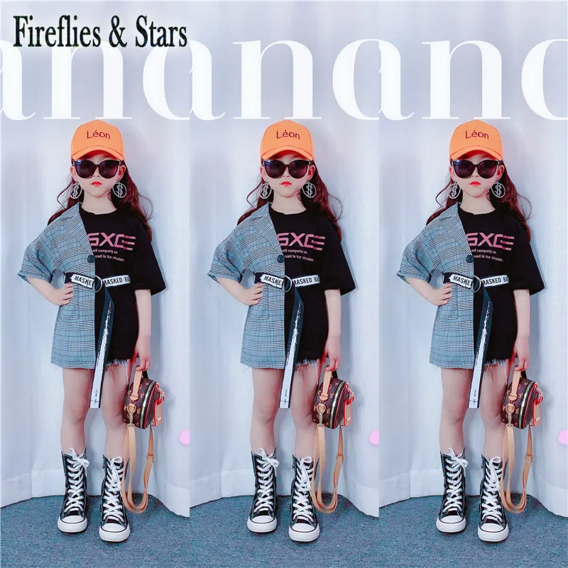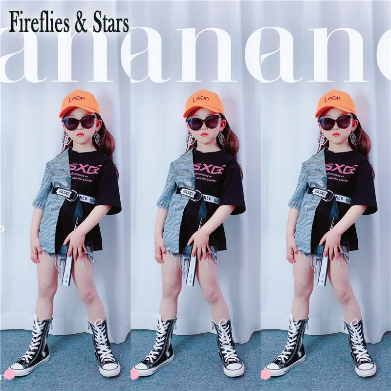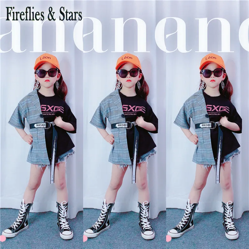 Название:Летняя футболка для девочек топы для малышей, Детская футболка Детская уличная одежда неправильная проверка, надпись, нашивка на пуговицах, от 4 до 14 лет
