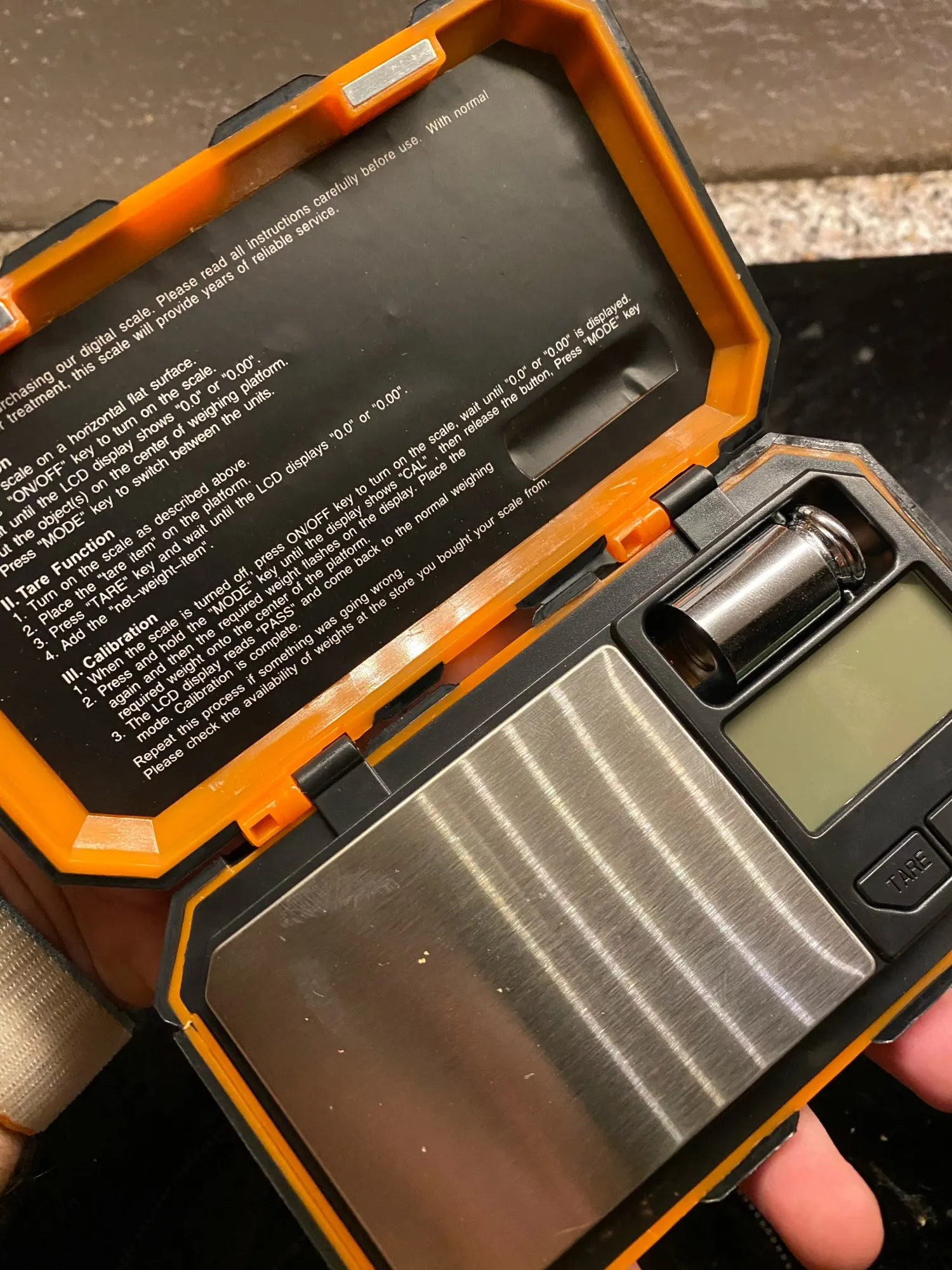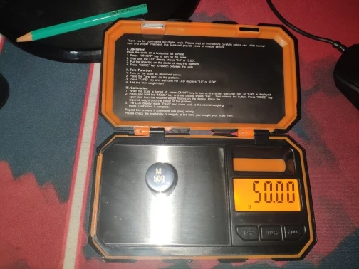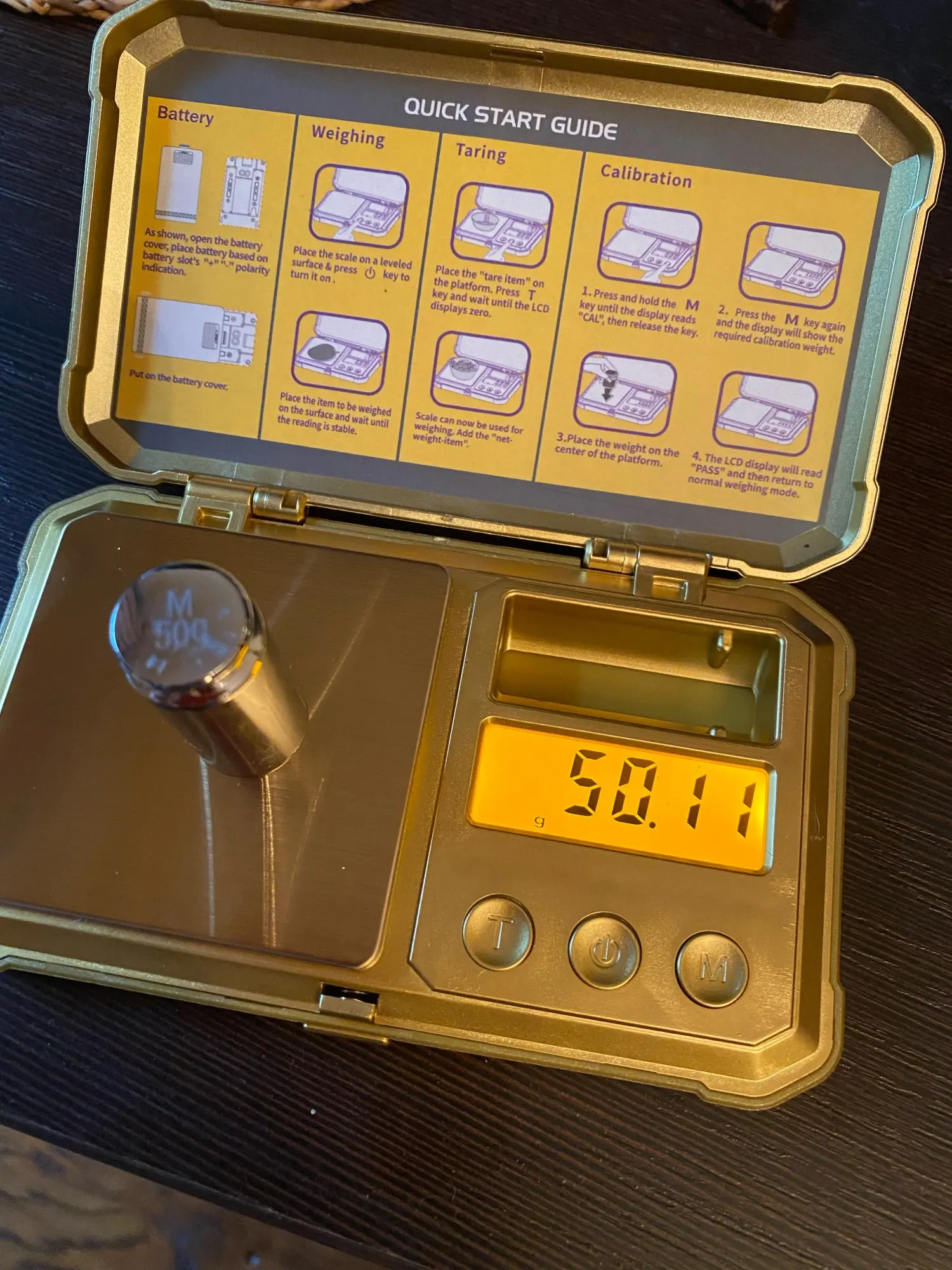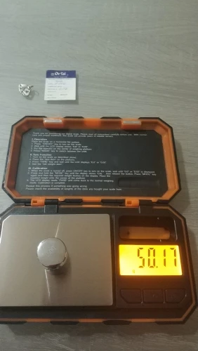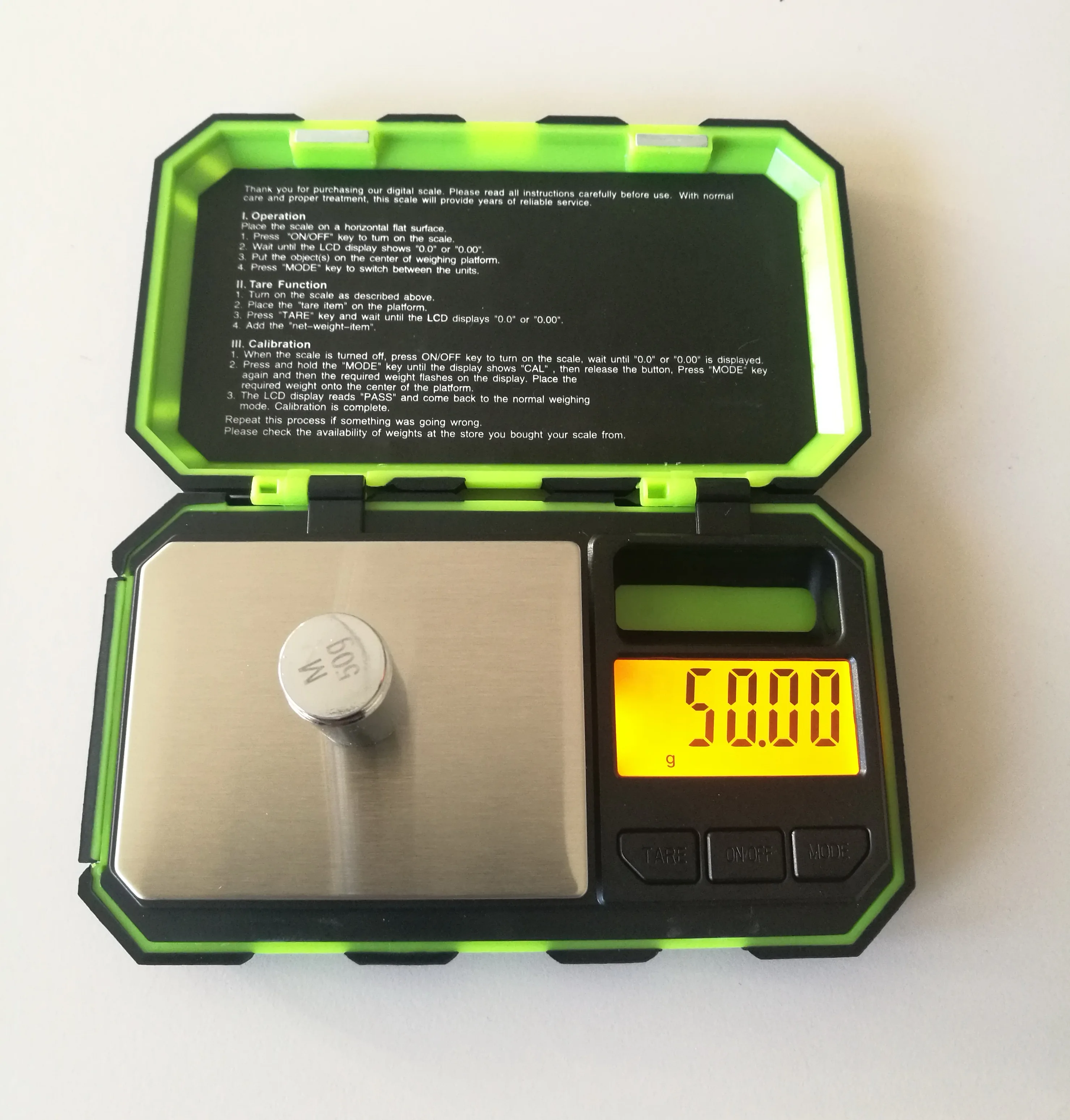 Калибровка не очень хорошая. Вес калибровки объявлен 50 г, затем на шкале 50,05