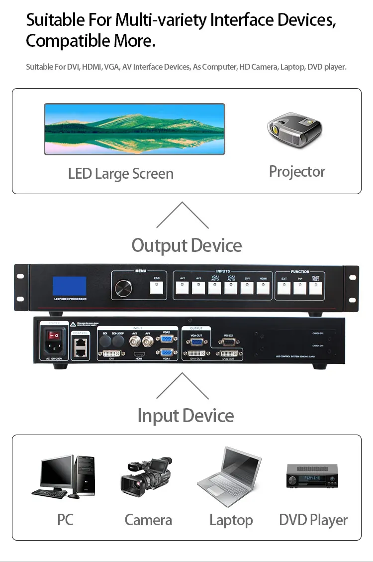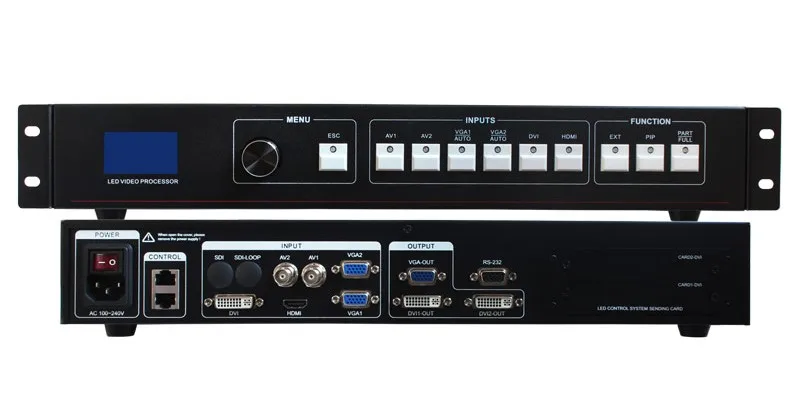 Больше видео вход-светодиодный видеопроцессор 6-ти канальный видео вход, 2 CVBS, 2 VGA, 1DVI, 1 HDML, в основном закрывает гражданских и промышленных применений. Переключение всех видео входов позволяет быстро резать и выцветать переходы.