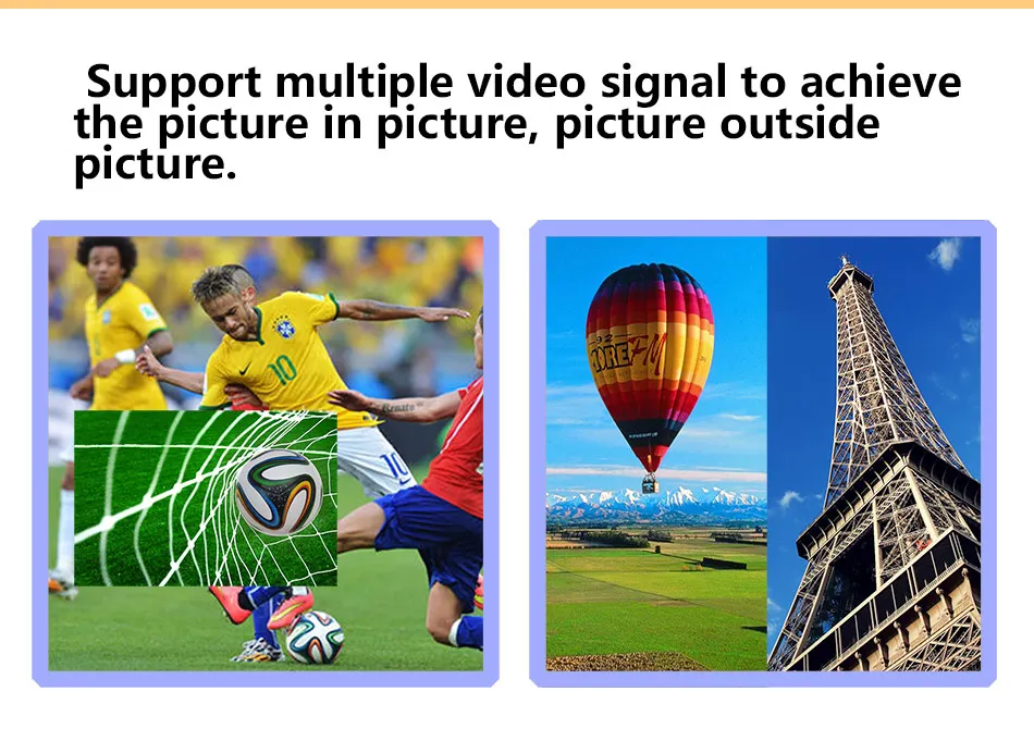 Технология предварительного переключения-технология предварительного переключения, переключение входного сигнала переключается для предсказания заранее ли входной сигнал канала. Эта функция уменьшает отключение линии или может быть из-за того, что чехол без входного сигнала для переключения непосредственно приводит к ошибкам, улучшает показатели успеха. Поддержка технологии PIP и POP - PIP без изменения состояния на исходном изображении, другой вход одного и того же или другого наложения изображений. Светодиодный видеопроцессор, Функция PIP, можно не только регулировать размер наложения, расположение, границы и т. д. вы также можете использовать эту функцию для достижения изображения за пределами изображения (POP), дисплей с двойным экраном.