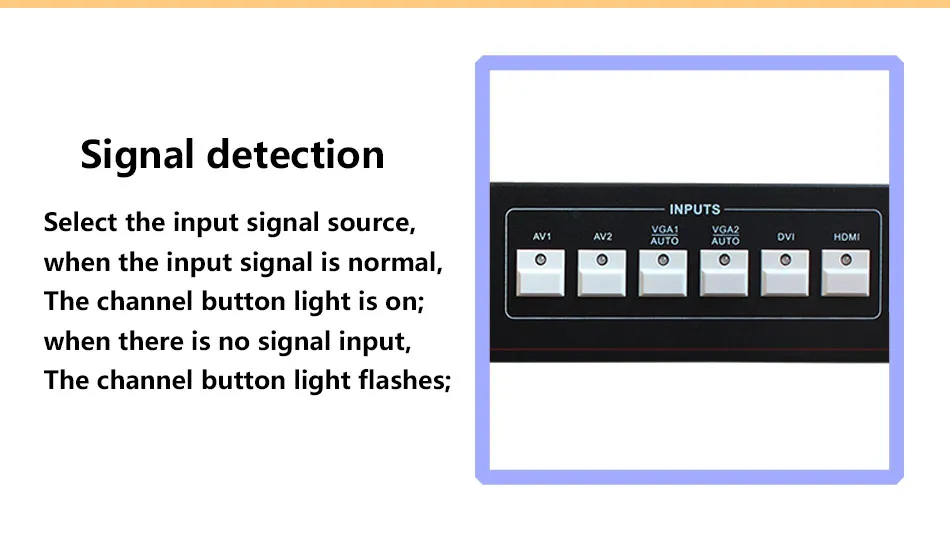 > Плавное переключение между любым каналом, выцветание > Поддержка большого соединения 10x10 > Функция обнаружения сигнала > Максимальное выходное разрешение: 2304*1152 @ 60 Гц 2560*816 @ 60 Гц > 6-канальный аналогово-цифровой видео вход: 2AV 1DVI 1HDML 2VGA > Технология предварительного переключения > 16 тестовых образцов > Функция PIP, функция P0P > Настройка ручки > Отправка слот для карты установка ящика