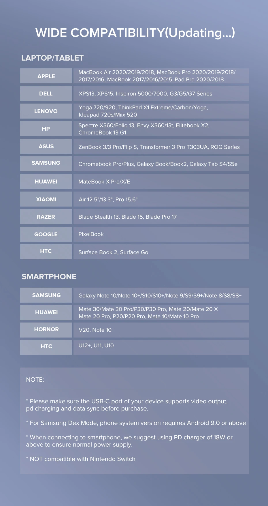 Отличное компактное устройство взамен оригинальной док станции samsung dex pad. Проверил на своем galaxy s10. Работает как с зарядным устройством так и без него. Но по непонятным причинам телефон не видит sd и microsd карты. Для надежности еще проверю на windows планшете.