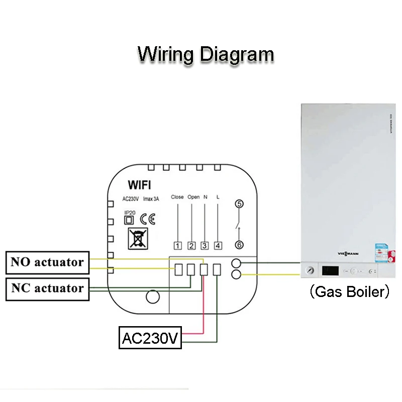 Подключите L и N к 220 напряжению, 5 и 6 к вашему газовому котлу. 1 и 2 предназначены для тепловых приводов, пожалуйста, не подключайте их к вашему газовому котлу.