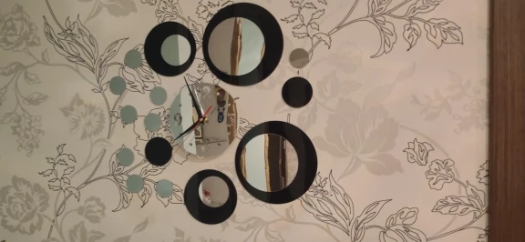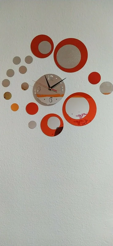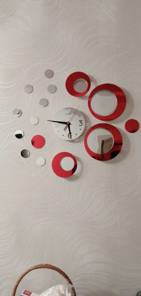 Хорошие часы, смотрится довольно эффектно. В диаметре вся композиция не более 50см. Защитную плёнку необходимо снимать после наклейки на стену. Крепится на 2-х сторонний скотч(идёт в комплекте), на обоях хорошо держится. Довольно долгая доставка, до Находки, около двух месяцев.