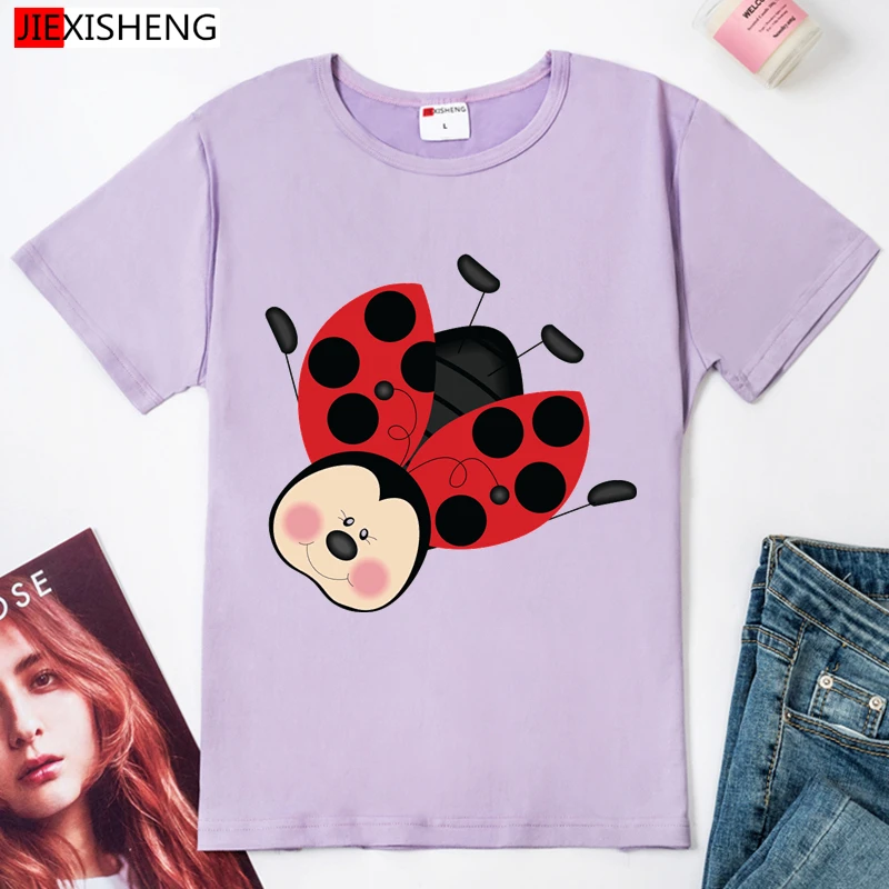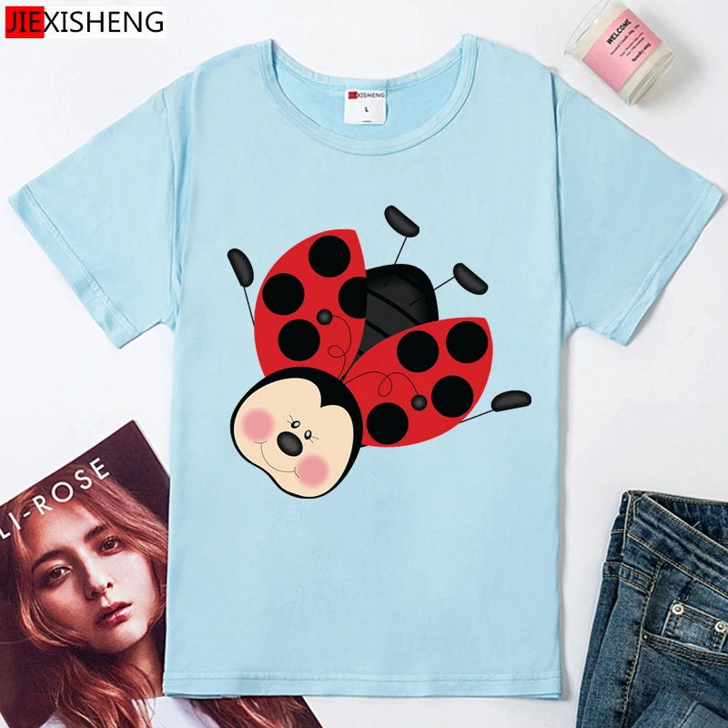 Летняя женская футболка, милые топы с короткими рукавами и круглым вырезом, футболка с принтом божьей коровки, Kawaii, белая женская одежда для девочек, HH519