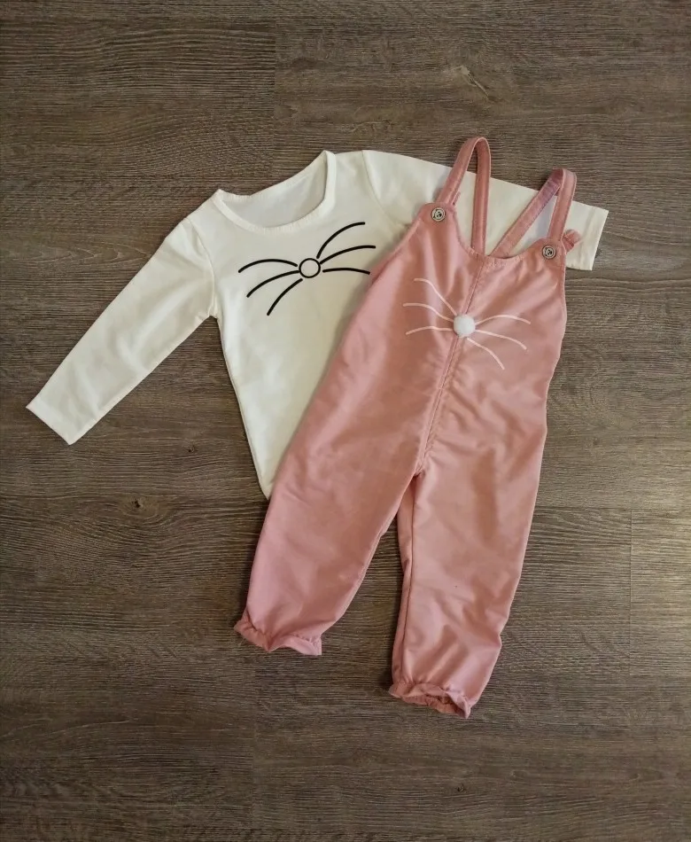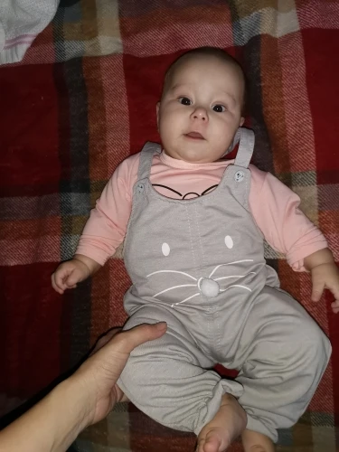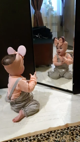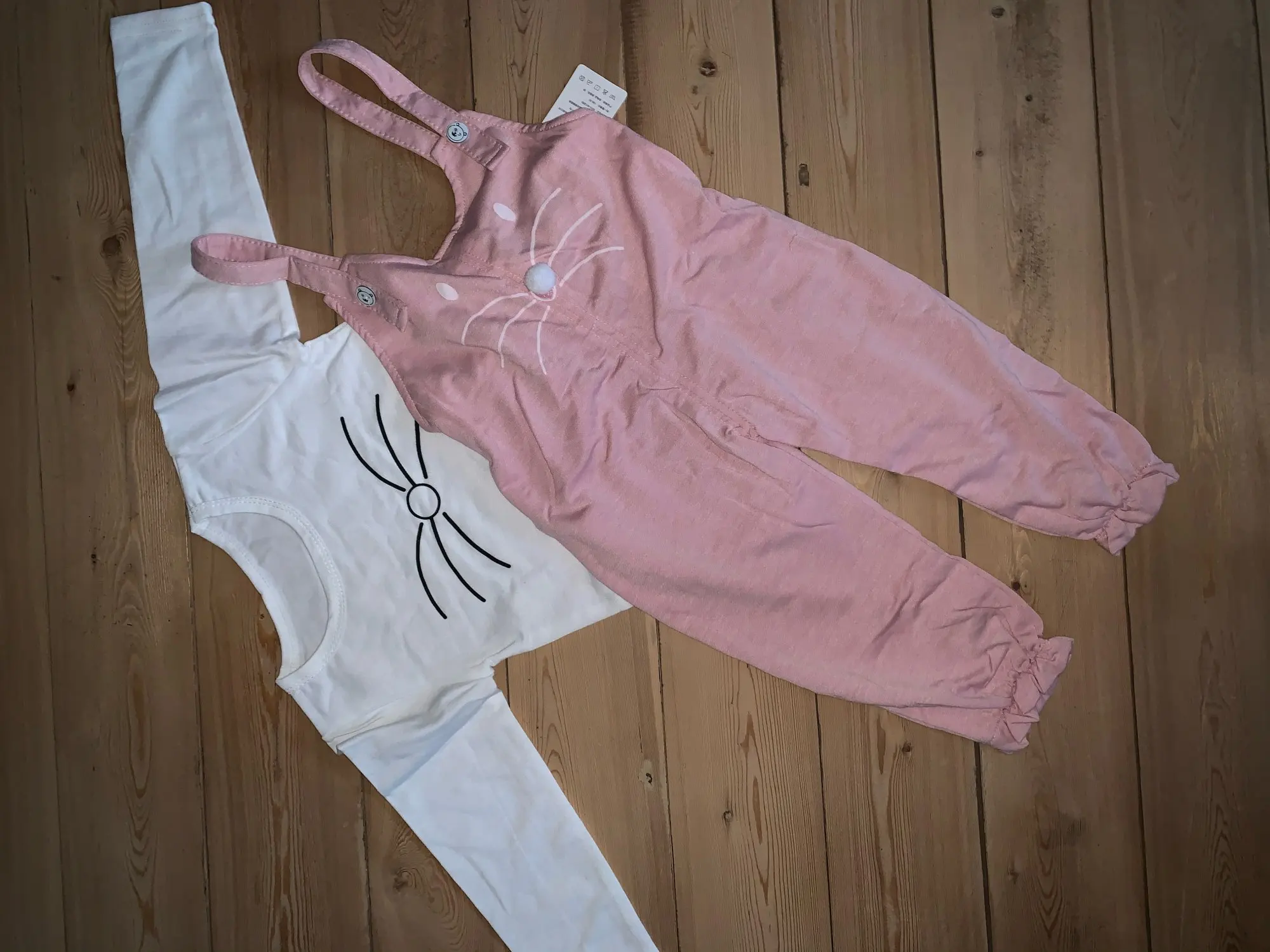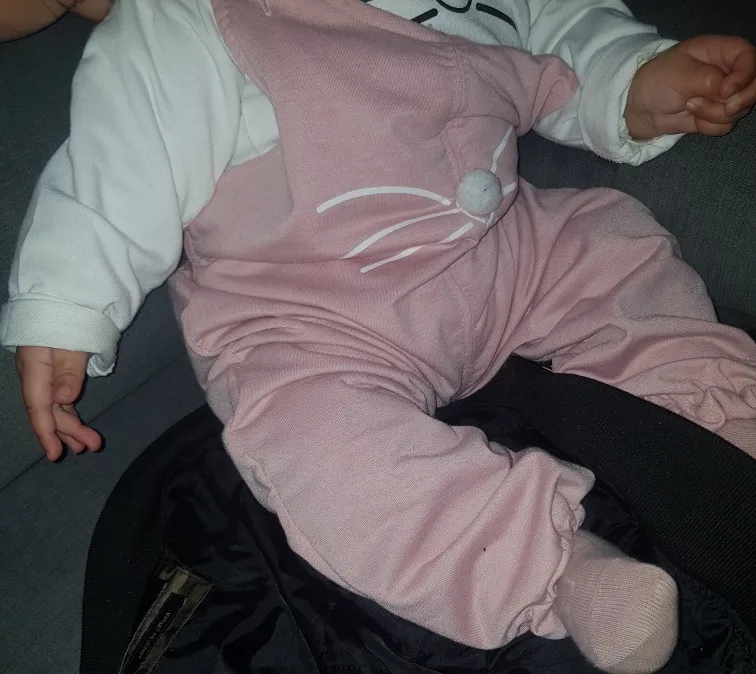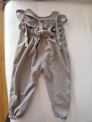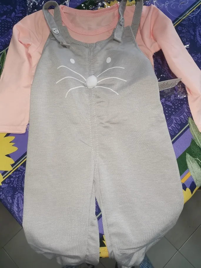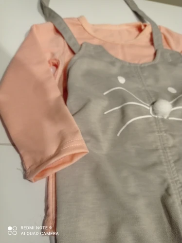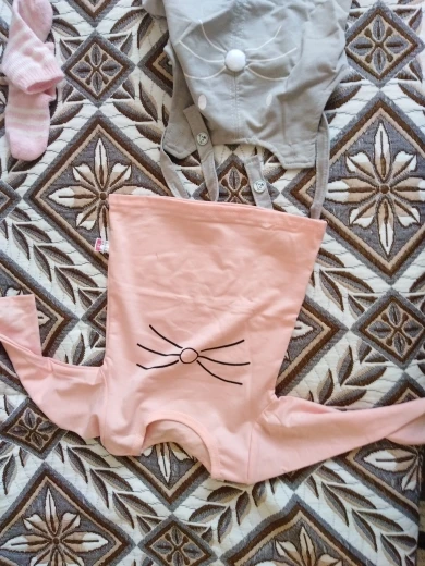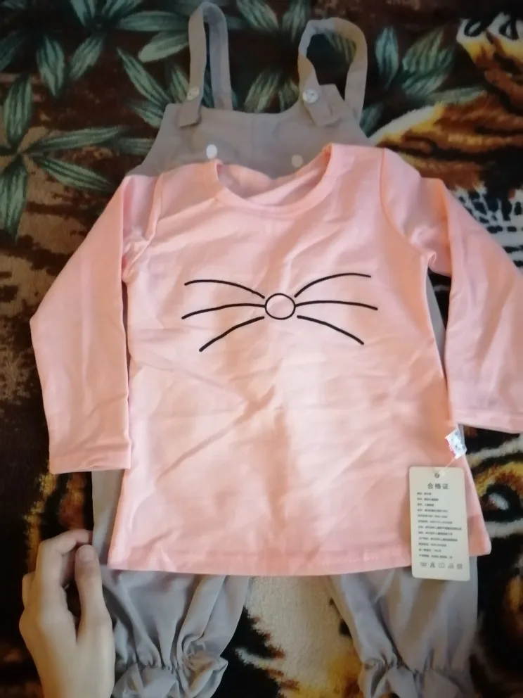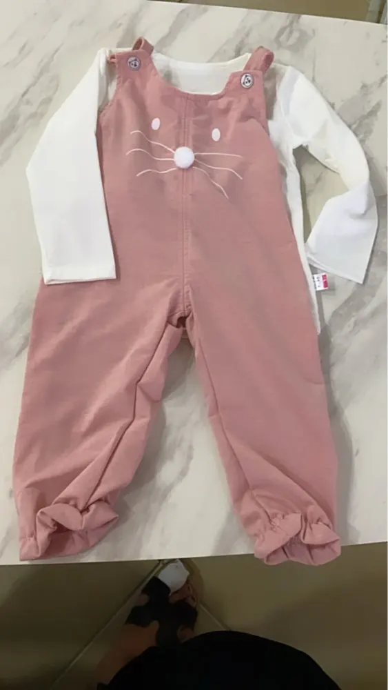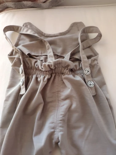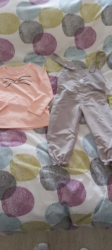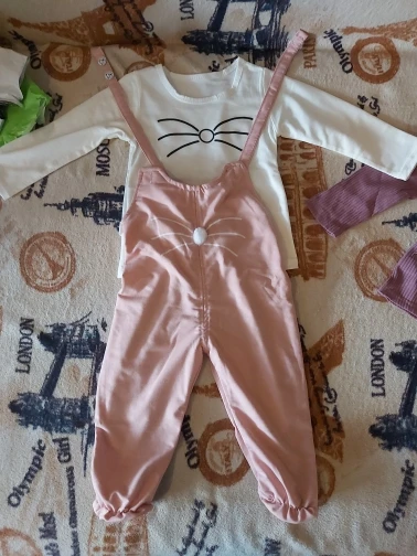 Размер не на 18мес, а на 2,5 - 3 года. Ткань пахнет хб, но на ощупь с синтетикой. Дочке 1,5, на комбезе перешью пуговицы, а кофта на вырост. Вообще комплект милый и стильный
