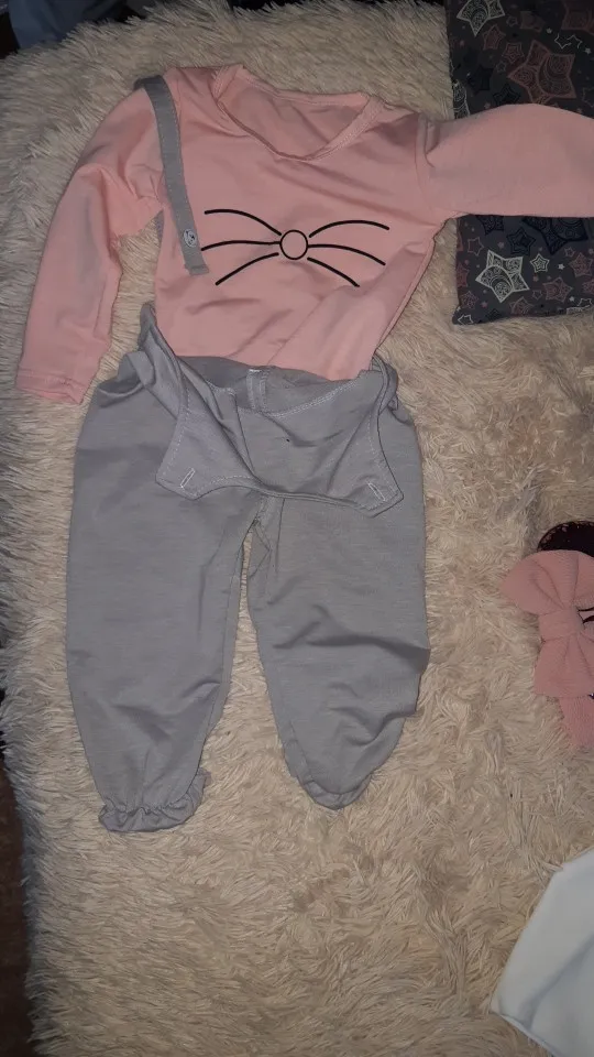 Очень хорошенький комплект, кофта нам большая сильно (76 см, 14 мес) комбез сидит хорошо немного длинный , за счёт резинок на ножках это не заметно