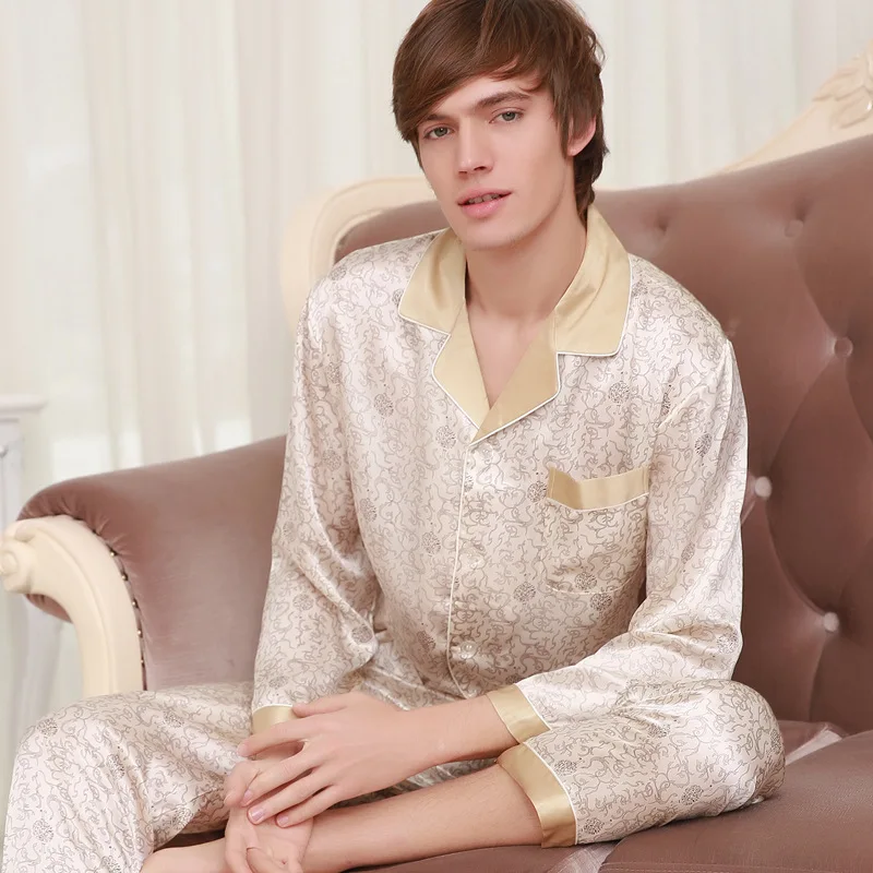 Мужская пижама из натурального шелка, модная пижама из 100% шелка с принтом, пижама с длинными рукавами, штаны, комплект из двух предметов, 039, 2020