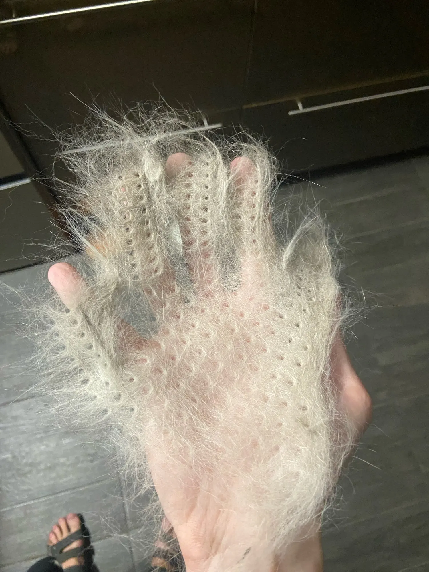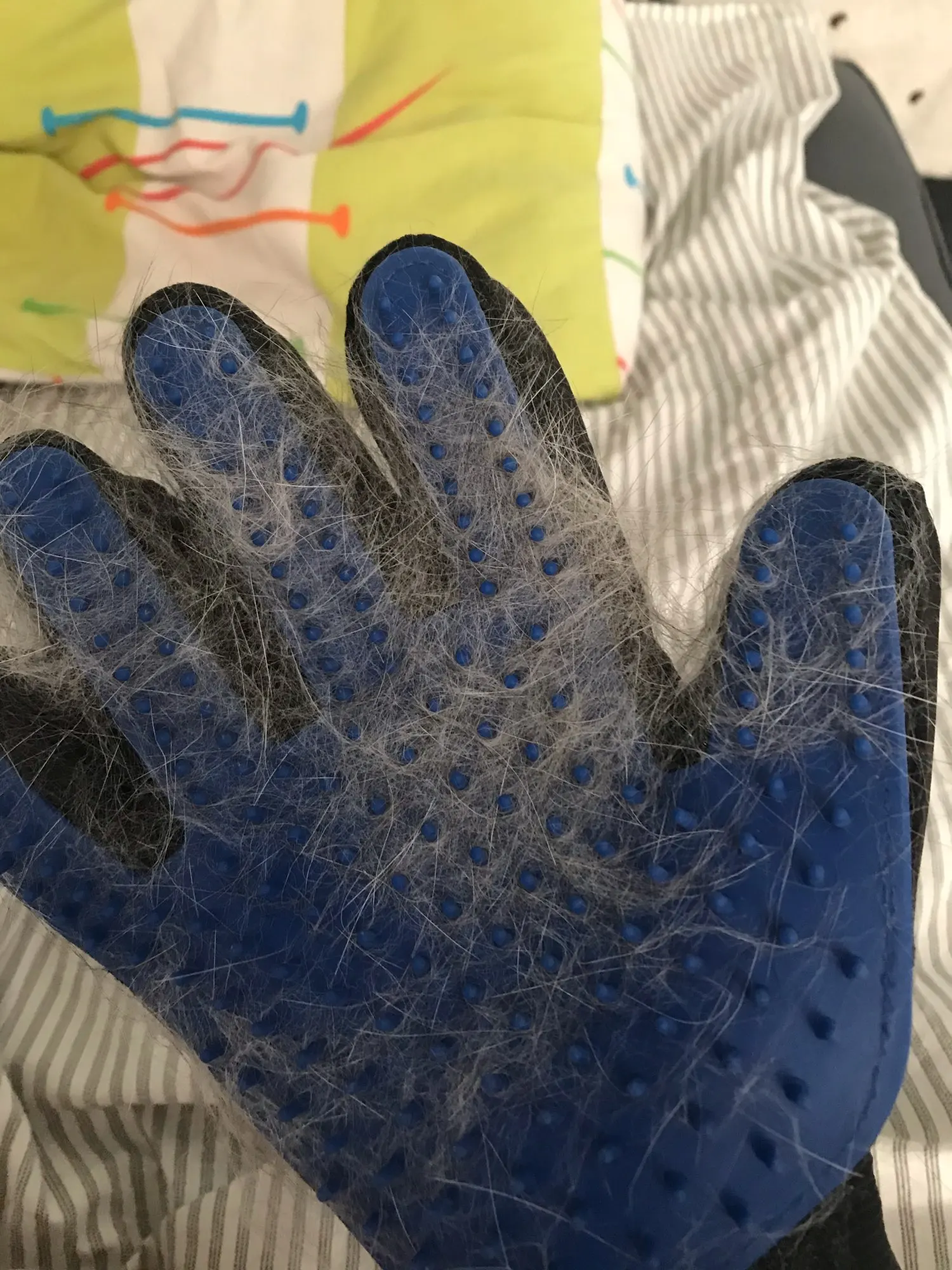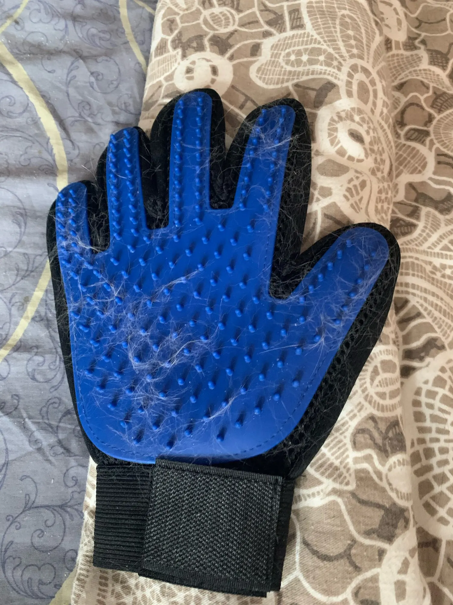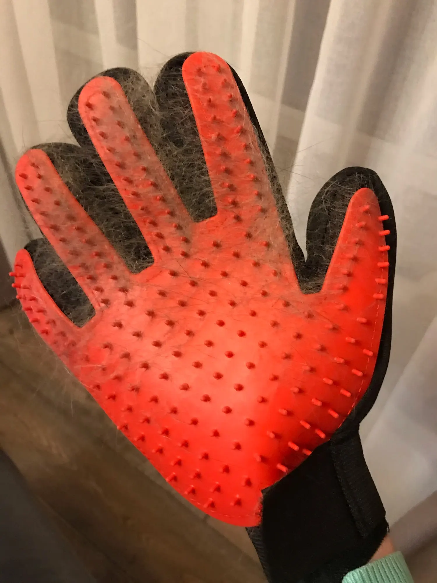 супер рукавица! волосы снимает на ура. У меня лайка с очень густой северной шерстью. За 1 минуту рукавицей получилось шикарно снять большинство вылезших волос.
