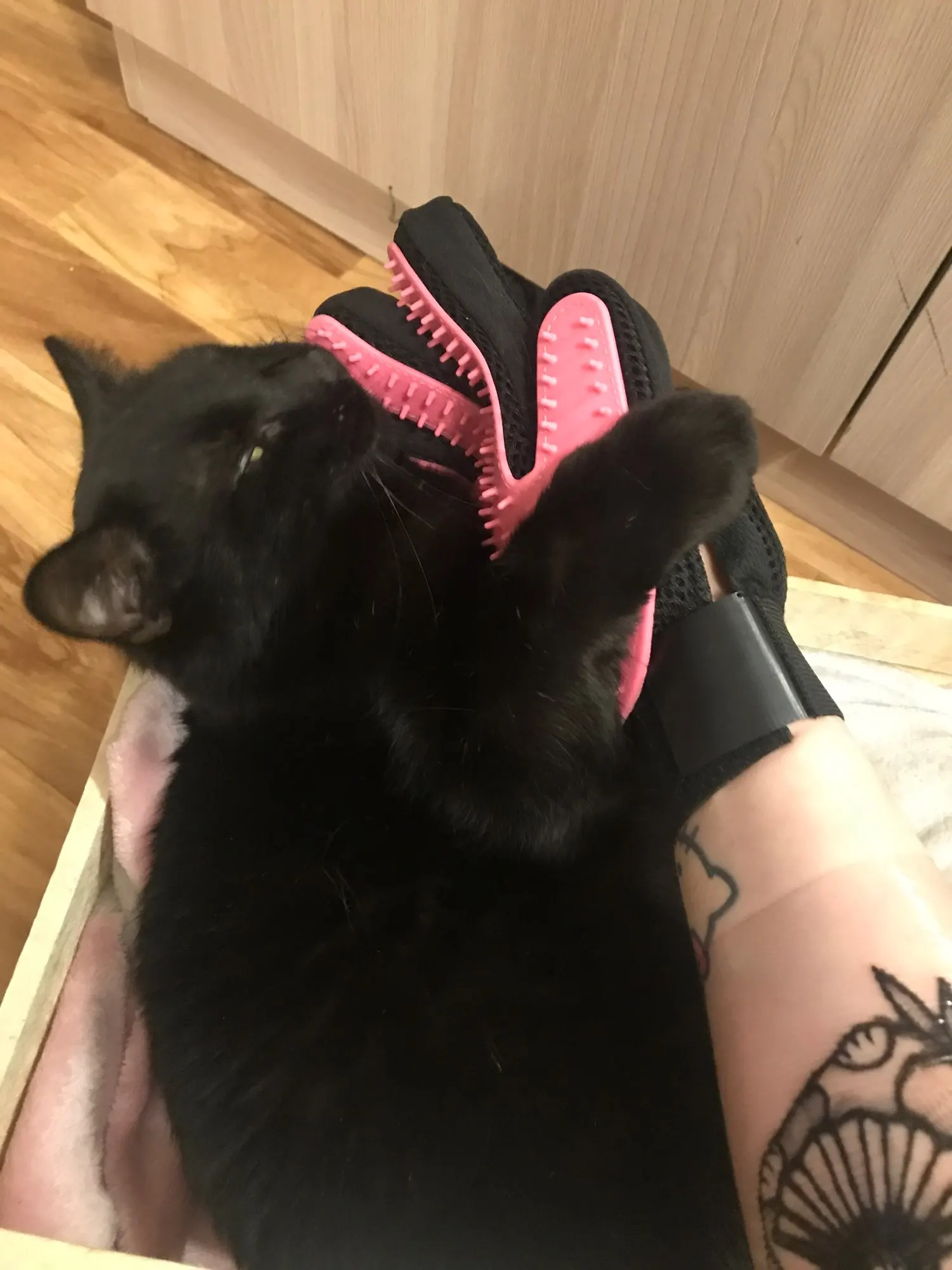 Перчатка бомба, кошка правда ссыт со страху приходится за шкиряк держать чтобы расчесать а в целом топ за свои бабки, пришла быстро 1,5 недели наверно в Нн.