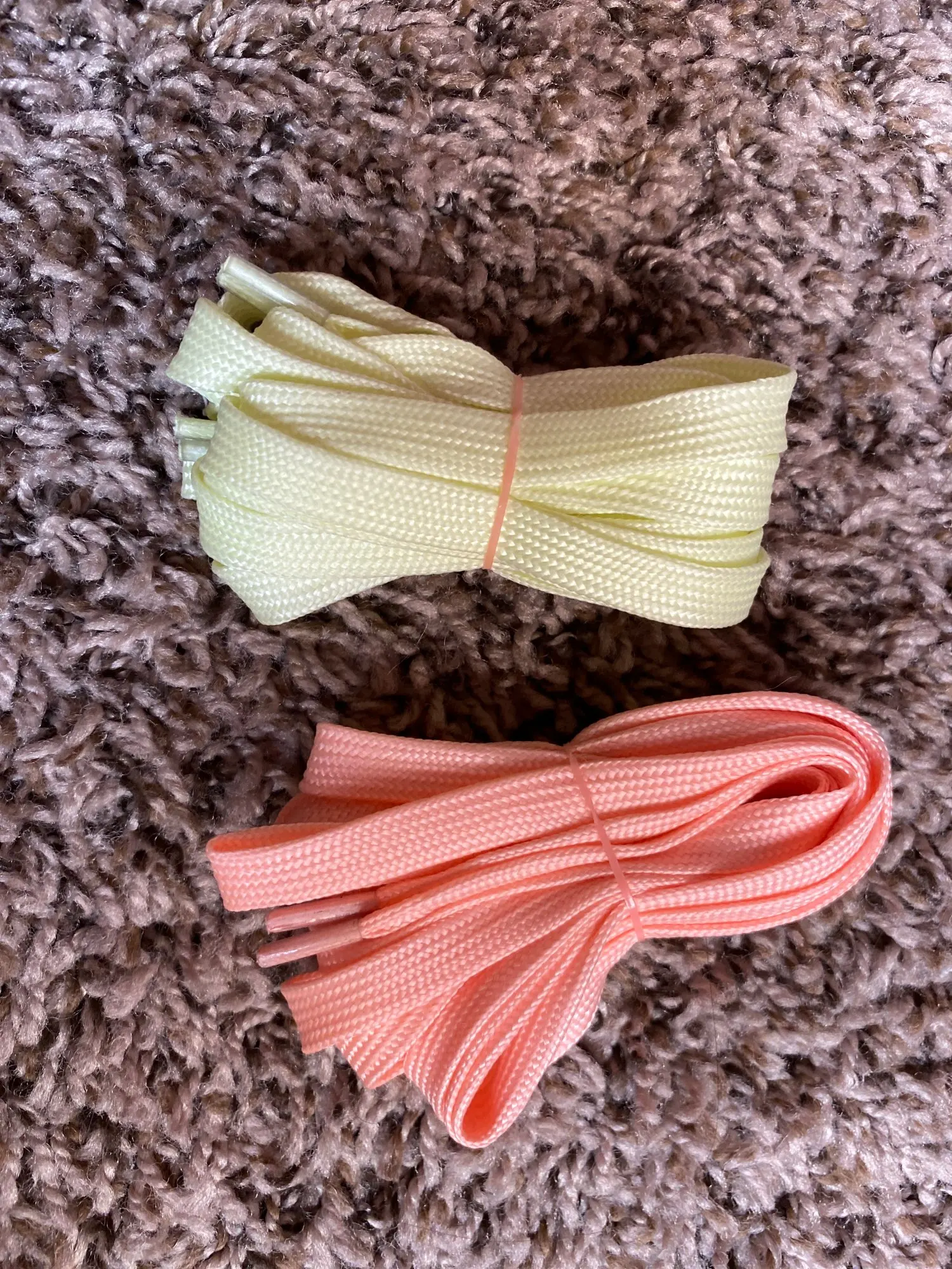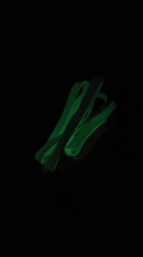 Шнурки пастельного цвета, в темноте светятся желто-зеленым, если предварительно зарядить фонариком.