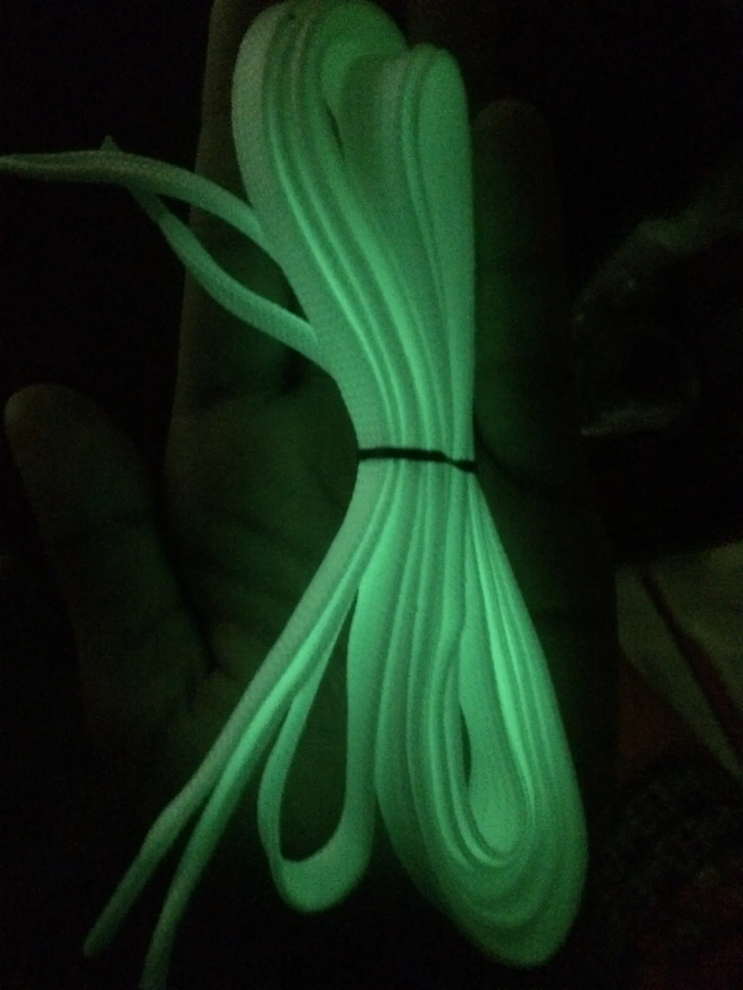 Шнурки соответствуют описанию! Светятся в темноте ее сильно ярко, но цвет приятный, мягко.