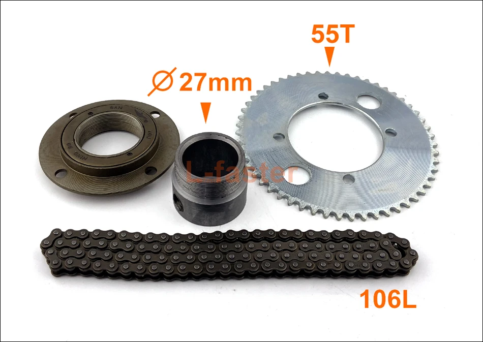 2). Этот комплект поставляется с цепным колесом 55T, что может позволить автомобилю работать быстро (10-дюймовое колесо около 25 км/ч), но крутящий момент низкий, если вы хотите высокий крутящий момент, вам лучше заменить это колесо цепи на 65T или 80T.