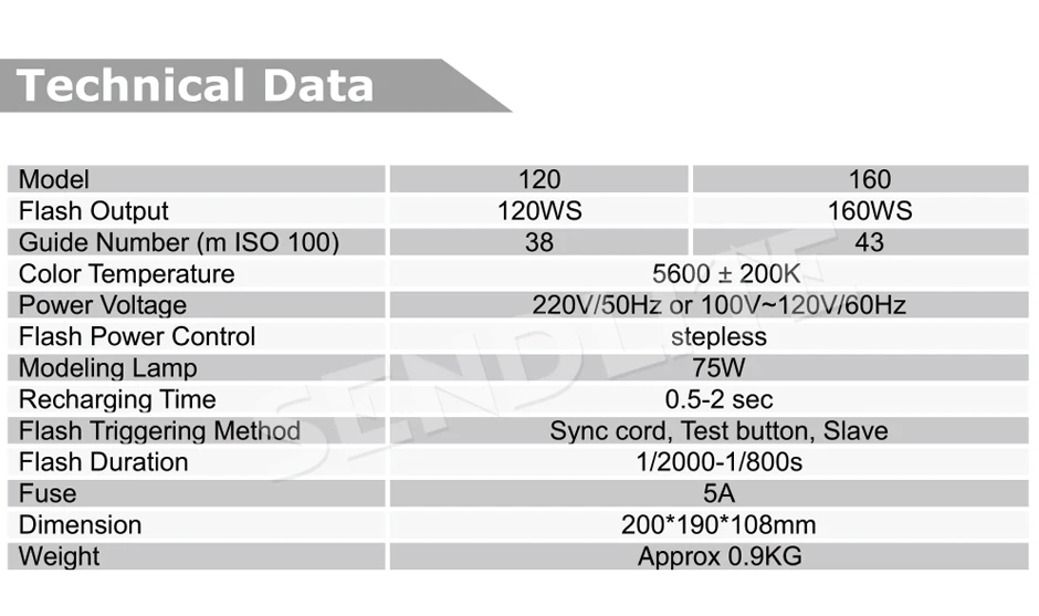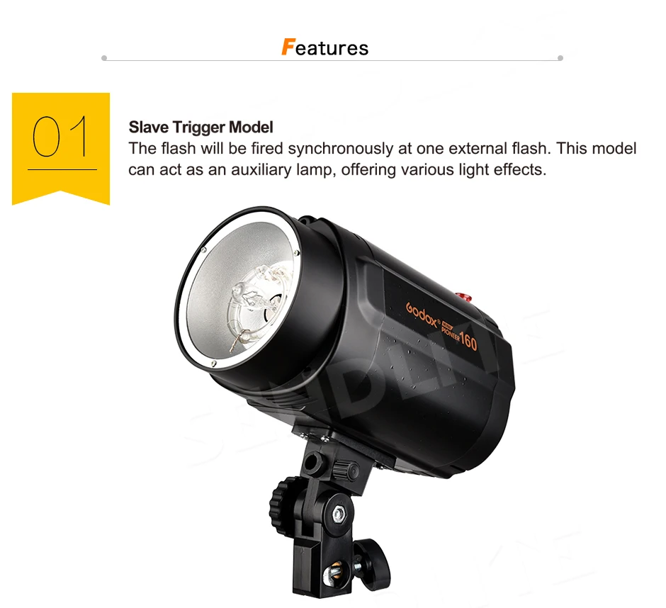 Выходная мощность: 160 Вт Входное напряжение: AC220V-240V / 50 Гц Время перезарядки: 0,5-2 сек. Моделирующая лампа: 75 Вт (регулируемая) Выходное управление: 8 шагов Продолжительность вспышки (сек.): 1/2000-1/800 Метод запуска вспышки: кнопка тестирования/slave/шнур синхронизации/инфракрасный Цветовая температура: 5400K ± 100K Вилка: штепсельная вилка переменного тока US / EU / AU / UK Предохранитель: 5AОсобенности: