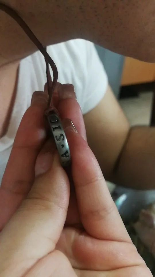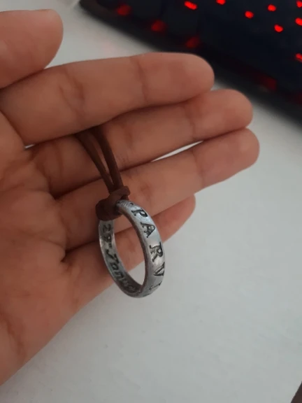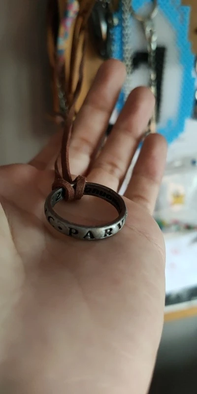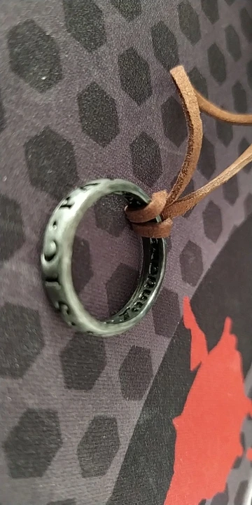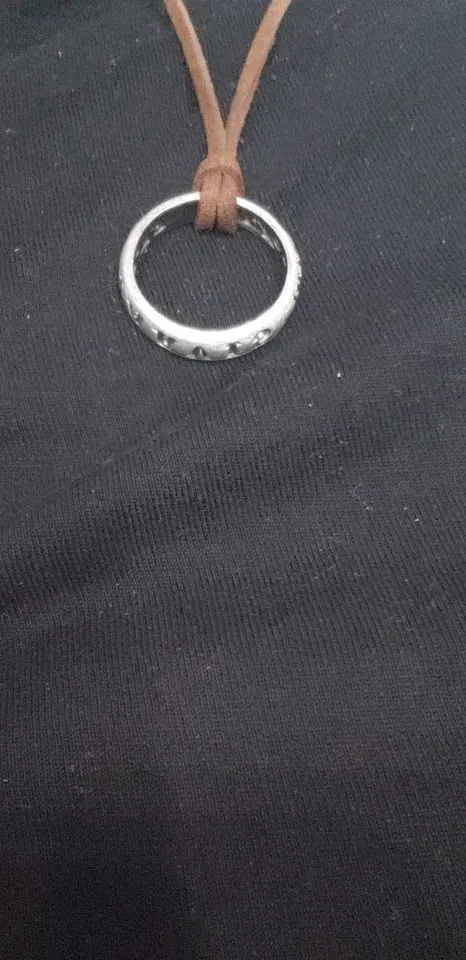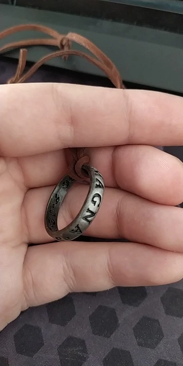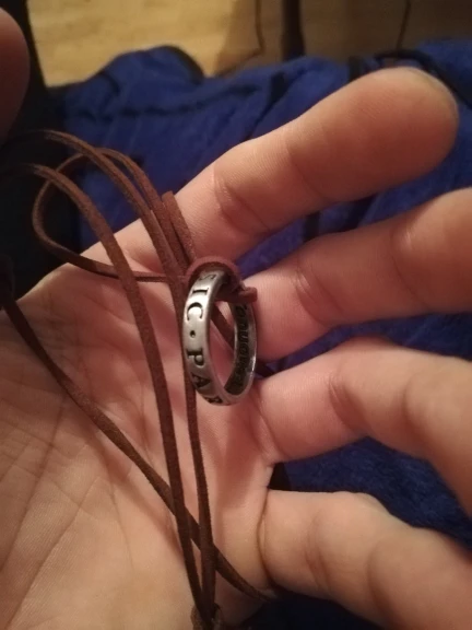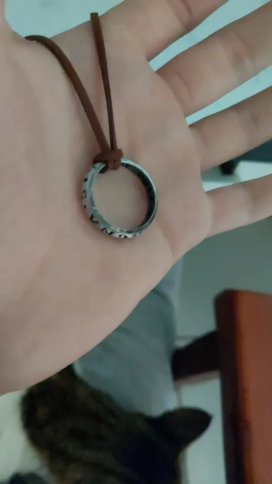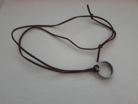 Кольцо выглядит хорошо, длина верёвки не позволяет носить его на шее, к тому же она, как мне кажется, будет натирать. Кольцо 2 сантиметра в диаметре. Товаром доволен. При первой отправке кольцо потеряли на почте, но продавец отправил повторно за 10 центов. Повторная доставка заняла примерно месяц.