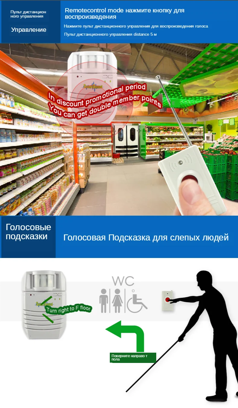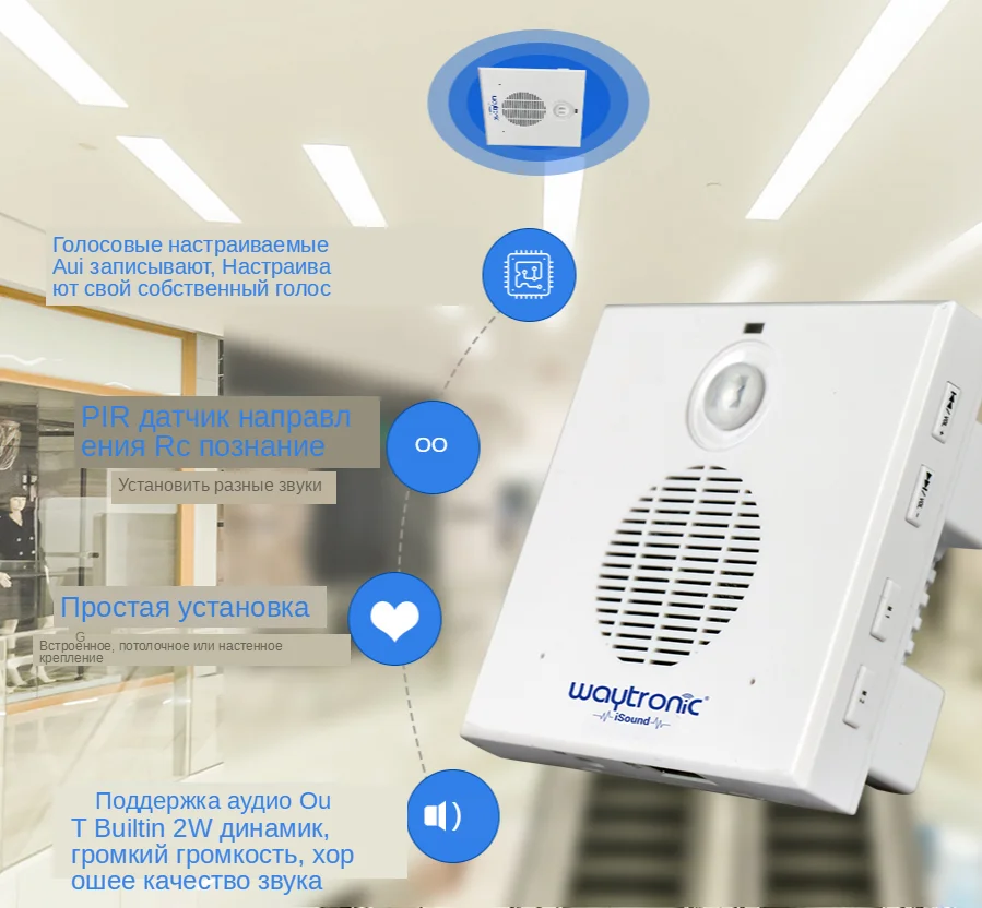 При обнаружении проходящего мимо человеческого тела, он может точно определить направление и воспроизвести голос, например, дать теплые подсказки, подсказки безопасности, приветствуем приветствие в первый раз.