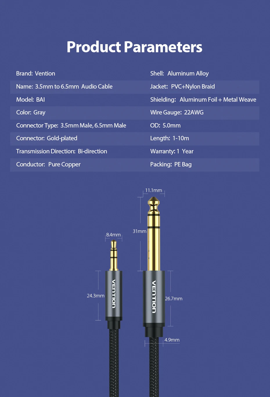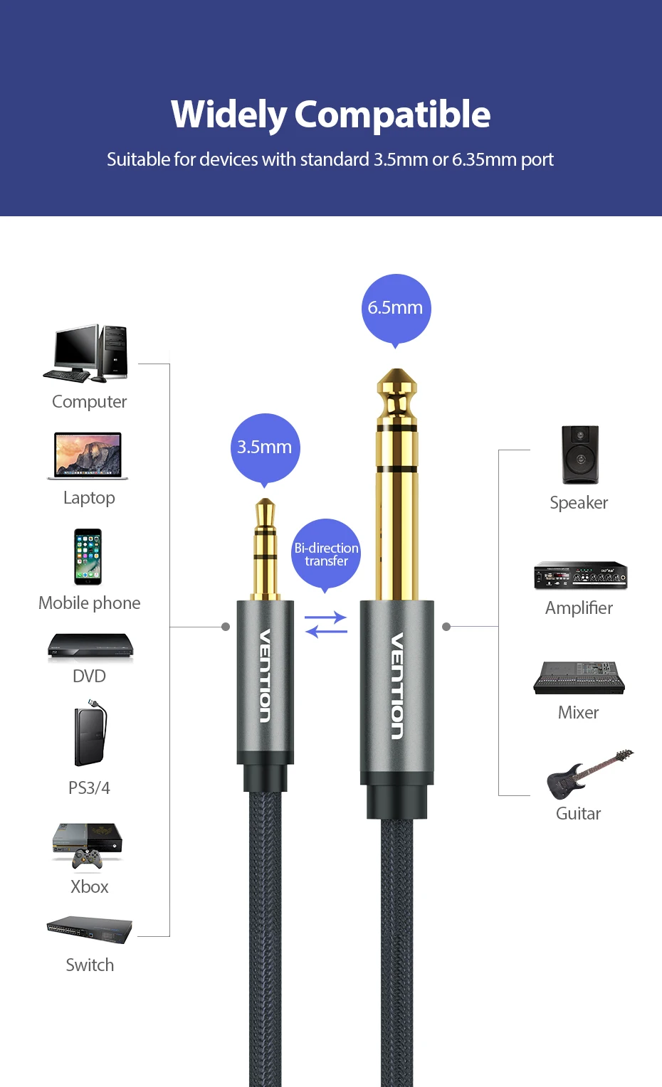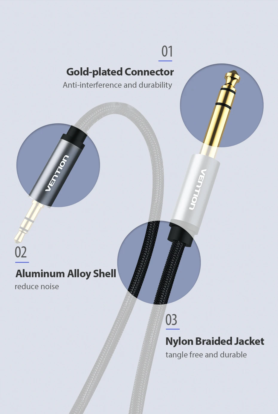 Переходник Vention штекер-штекер 3,5 мм на 6,35 мм, кабель Aux для усилителя микшера, позолоченный штекер 3,5 на штекер 6,5 3 м 5 м 10 м Aux Cabo