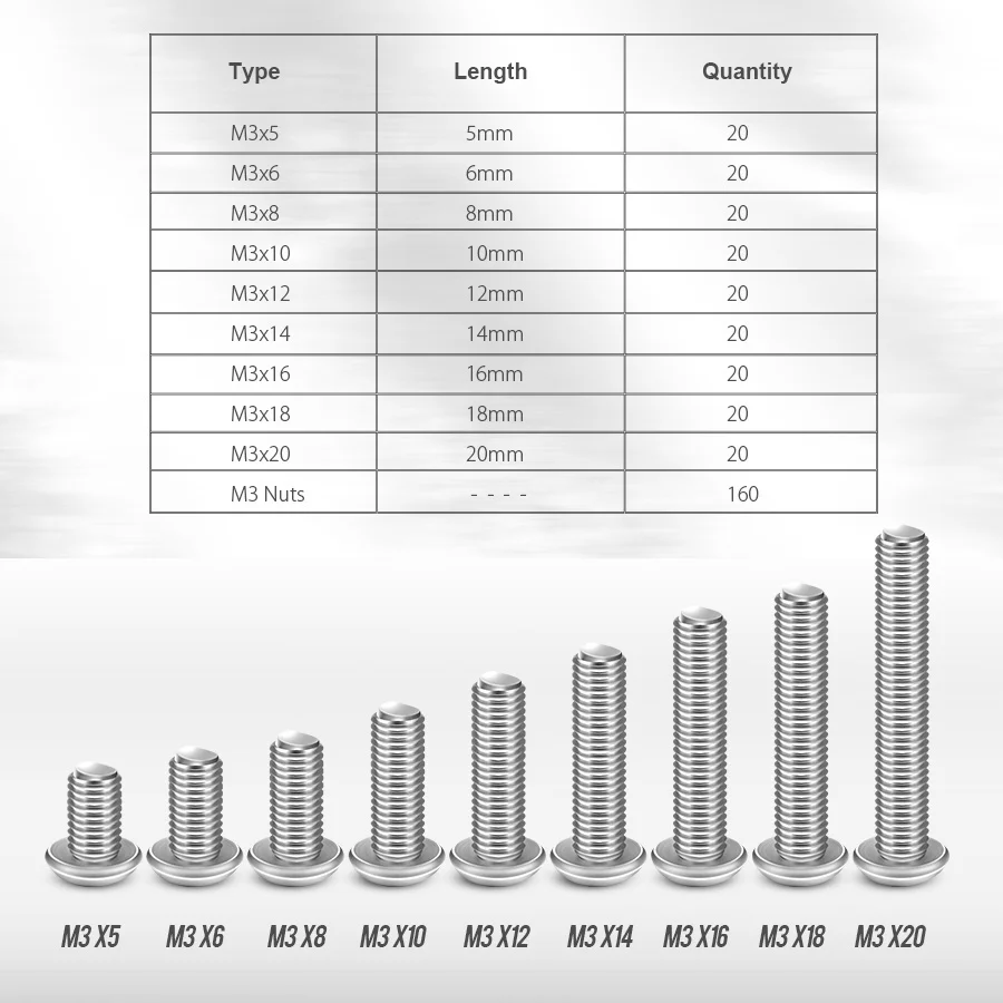 340 шт. M3 * 5-20 мм нержавеющие болты с шестигранной головкой, болты с шестигранным углублением в ассортименте, набор гаек