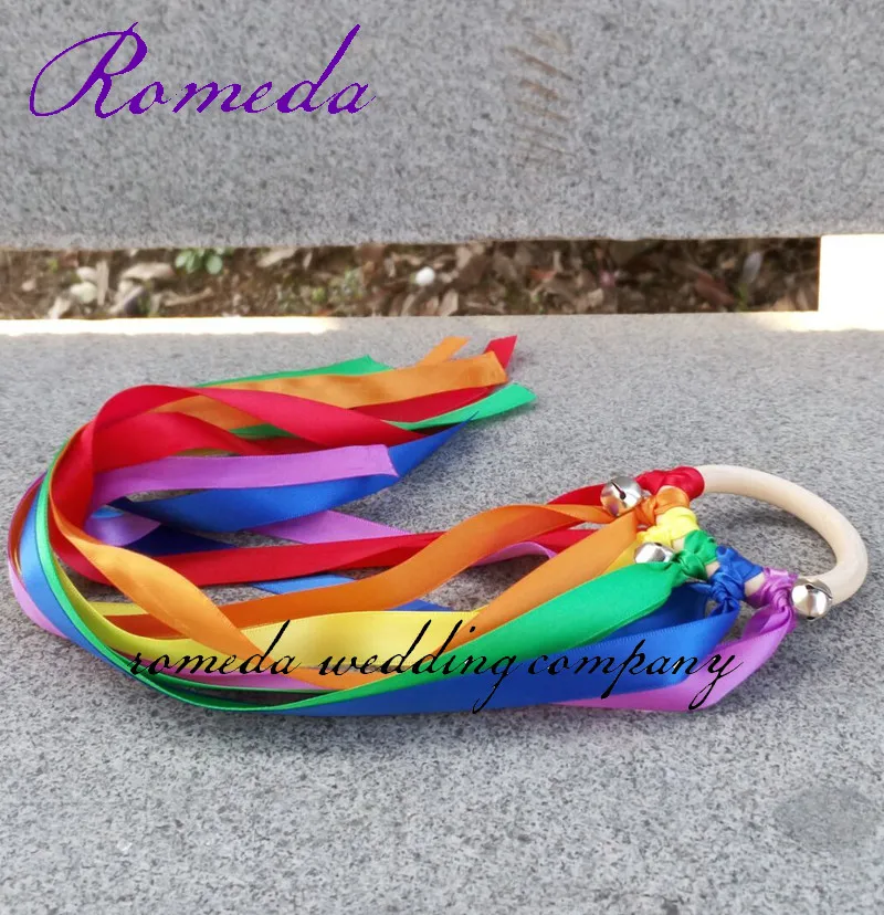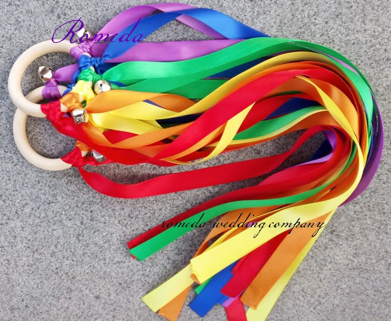 Новинка, 10 шт.лот, цветная Радужная пятнистая лента, деревянное кольцо с серебристым колокольчиком для ручного Кайта, игрушка FLY ME, день рождения вечерние вечеринки