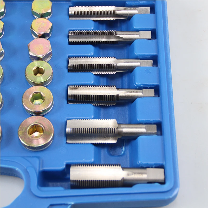 114 шт. Набор для ремонта масляных поддоновДля ремонта отстойника, набор инструментов для слива коробки передачКомплексный набор для ремонта ниток идеально подходит для ремонта отстойника, коробки передач и дифференциальных сливных вилок.Используется для слегка превышения размера поврежденной нити, затем подходит к новой сливной вилке и стиральной машине.Набор подходит для самых популярных нитей, используемых на автомобилях и светильник для коммерческих автомобилей.Размеры крана.M13 x 1,25, M13 x 1,5, M15 x 1,5, M17 x 1,5,M20 x 1,5, M22 x 1,5 мм