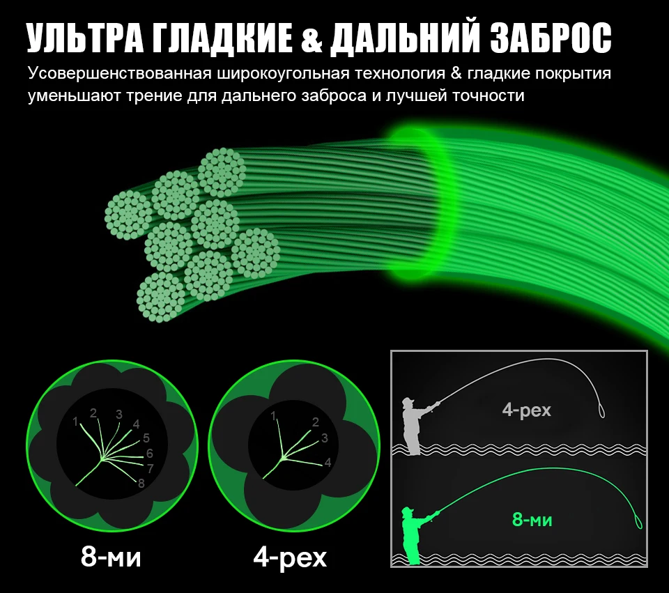 Шнур пришёл какой нужно, никаких замечаний пока не нашлось. Тонкий, гладкий, соответствует 8-ми жилке, на счёт разрывной способности: 70% примерно держит от заявленой, проверялось не на оборудовании, поэтому не точно.